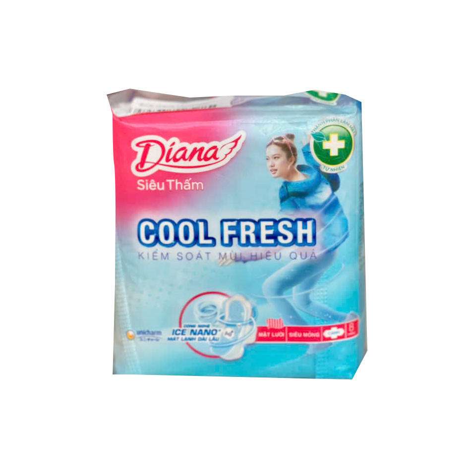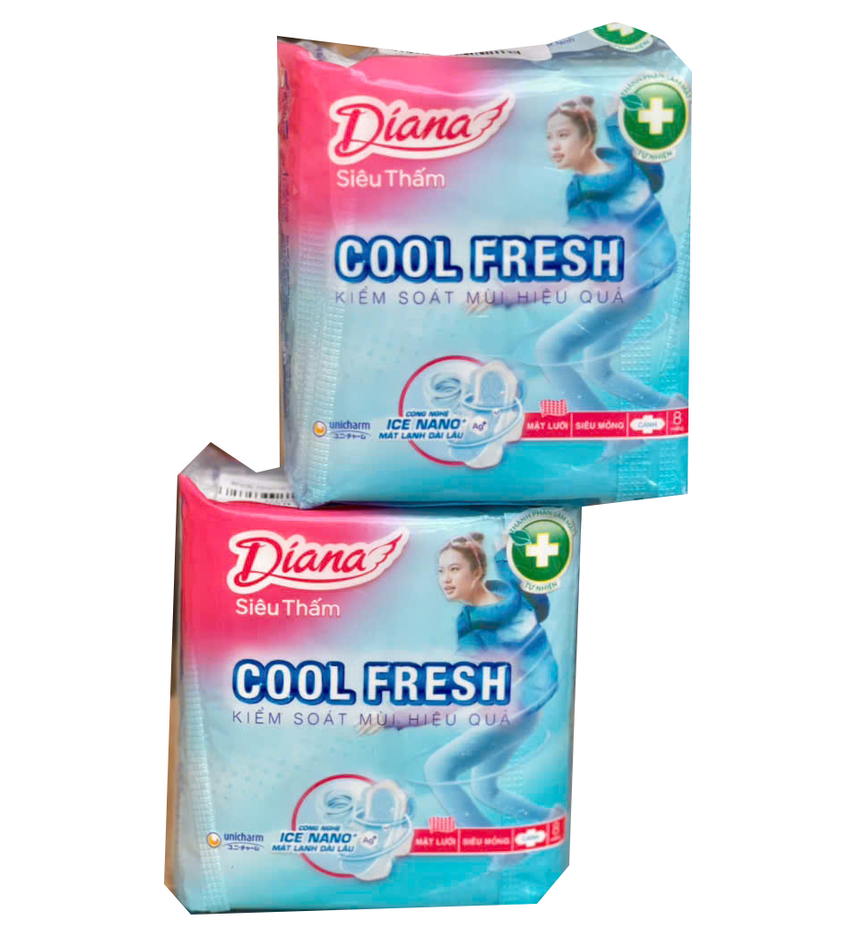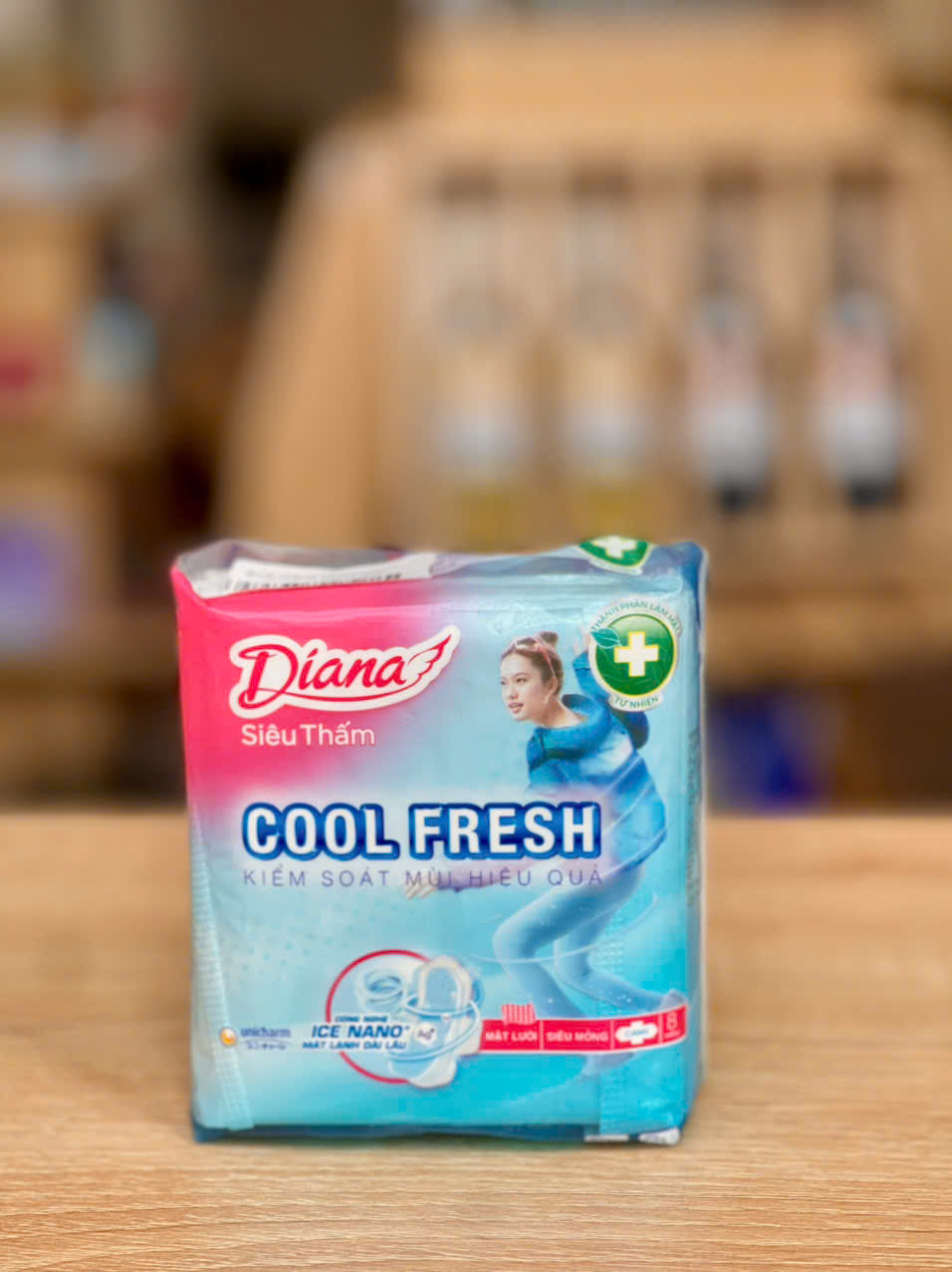 Băng vệ sinh Diana Siêu Thấm Cool Fresh ứng dụng công nghệ Ice Nano, mang lại cảm giác mát lạnh sảng khoái và dễ chịu.