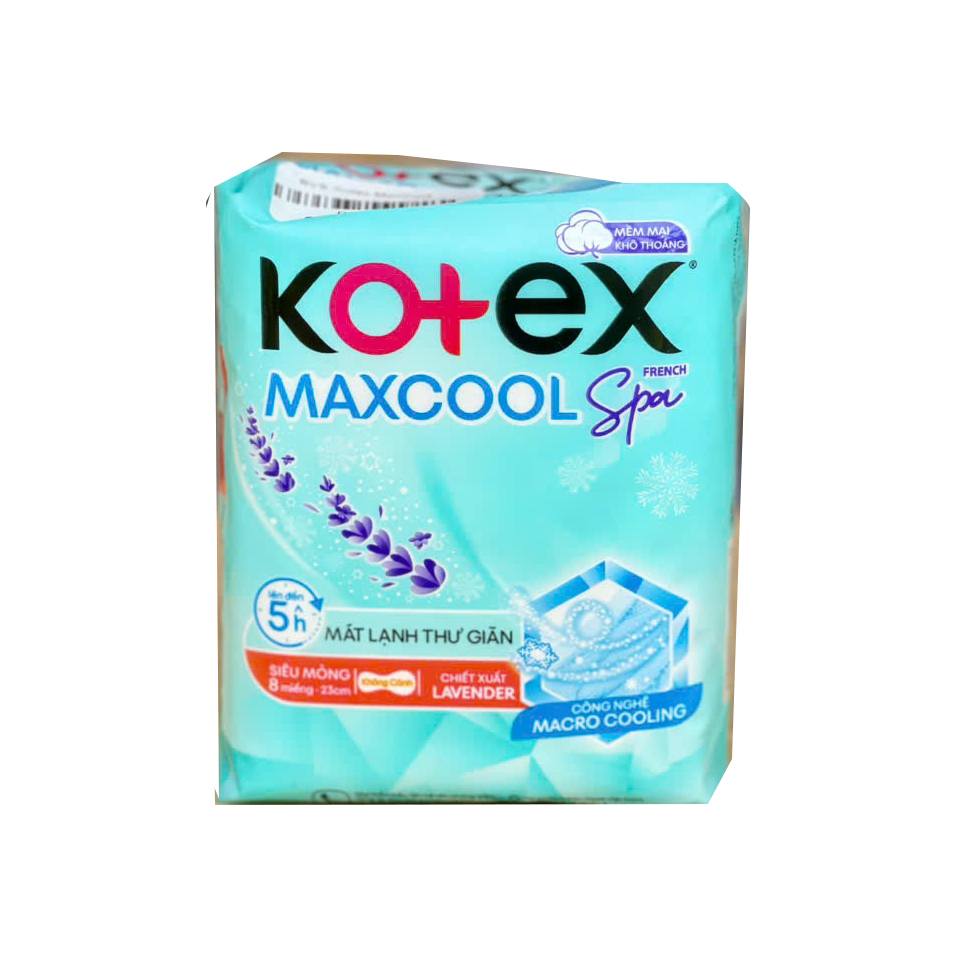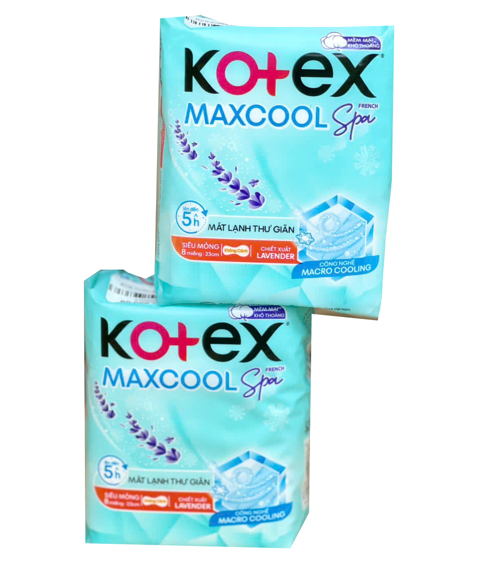 Băng vệ sinh Kotex MaxCool Spa siêu mỏng cánh, thấm hút tốt, giúp khô thoáng và thoải mái trong suốt kỳ kinh.