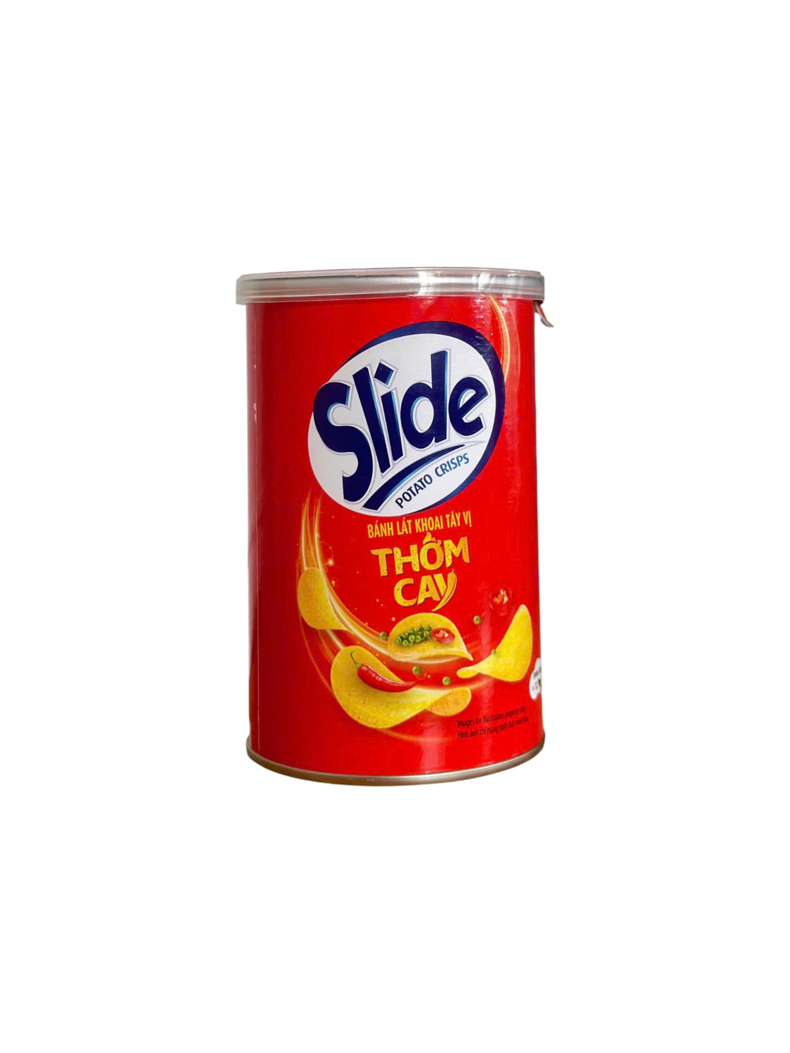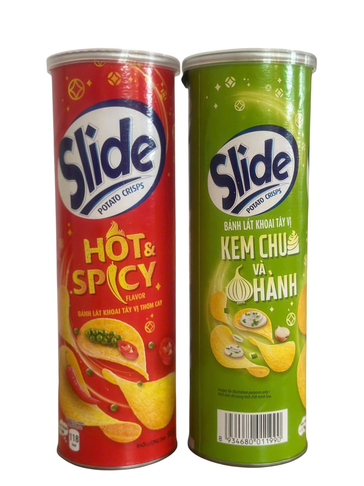 Snack khoai tây Slide dạng hộp 90g với lát khoai giòn rụm, hương vị đậm đà dễ ăn. Có hai vị phổ biến: Hot & Spicy thơm cay kích thích vị giác và Kem Chua & Hành béo nhẹ, thơm dịu. Tiện lợi mang theo, phù hợp ăn vặt mọi lúc.