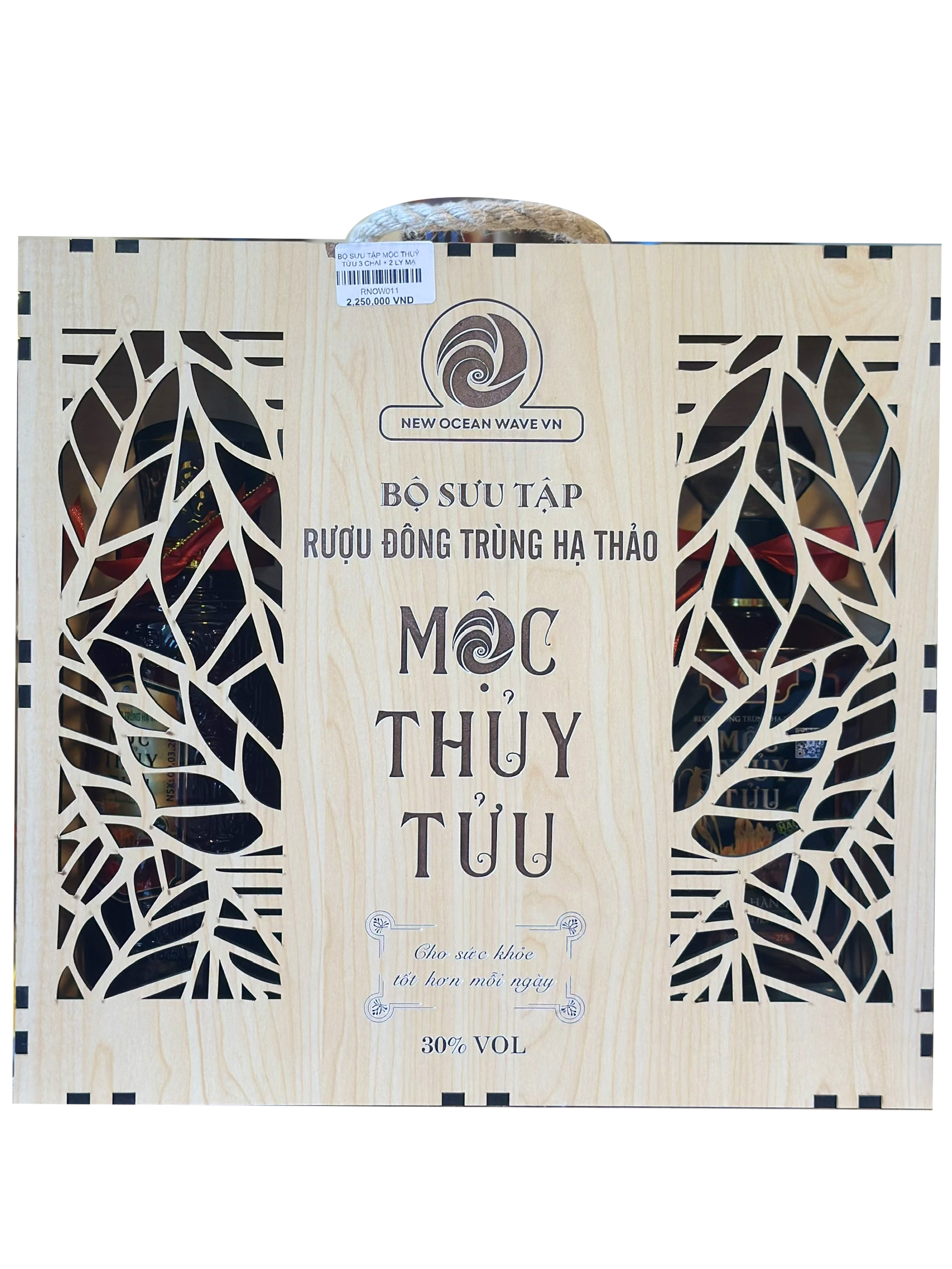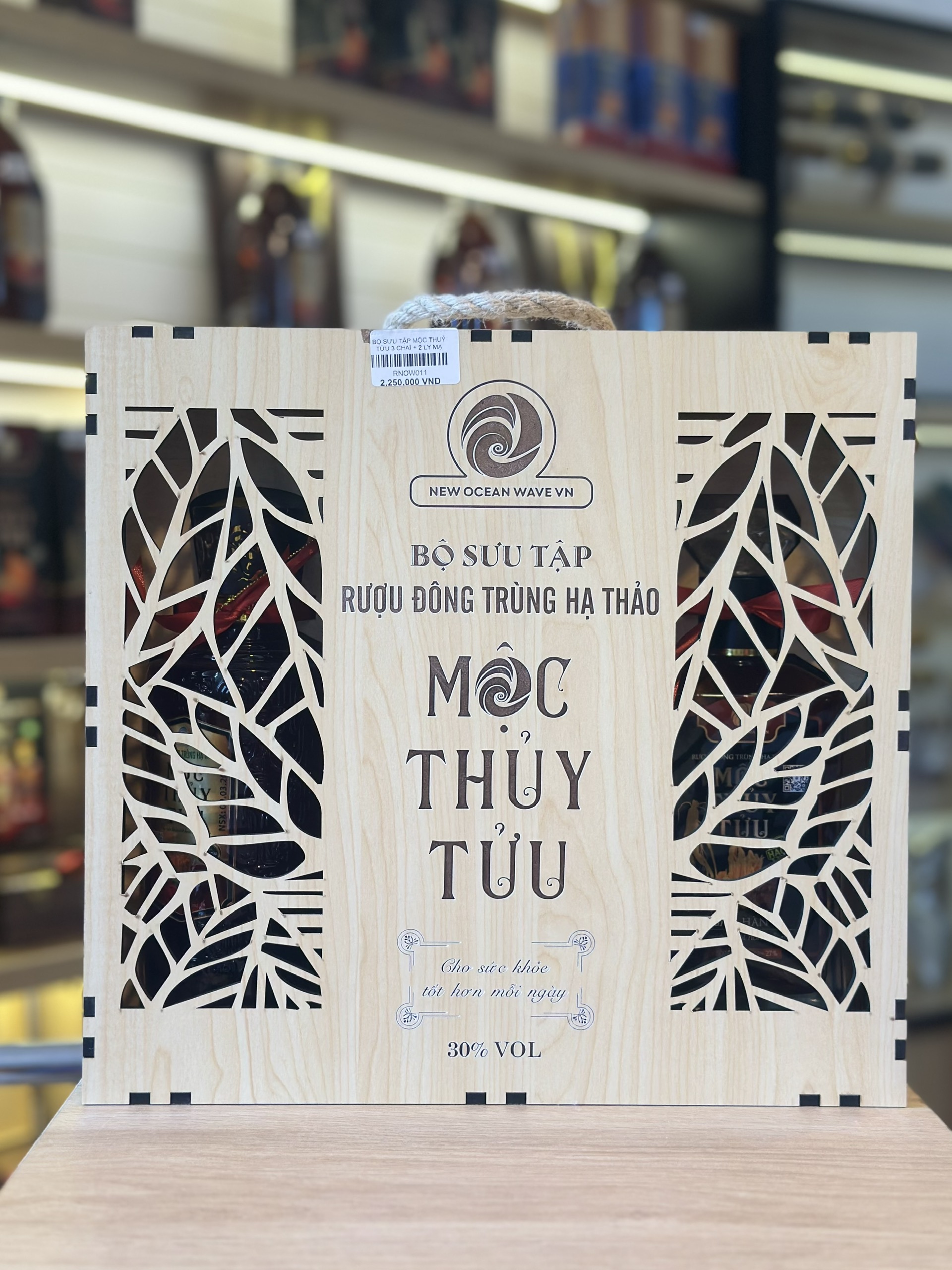 BỘ SƯU TẬP MỘC THUỶ TỬU 3 CHAI + 2 LY MẠ VÀNG HỘP GỖ