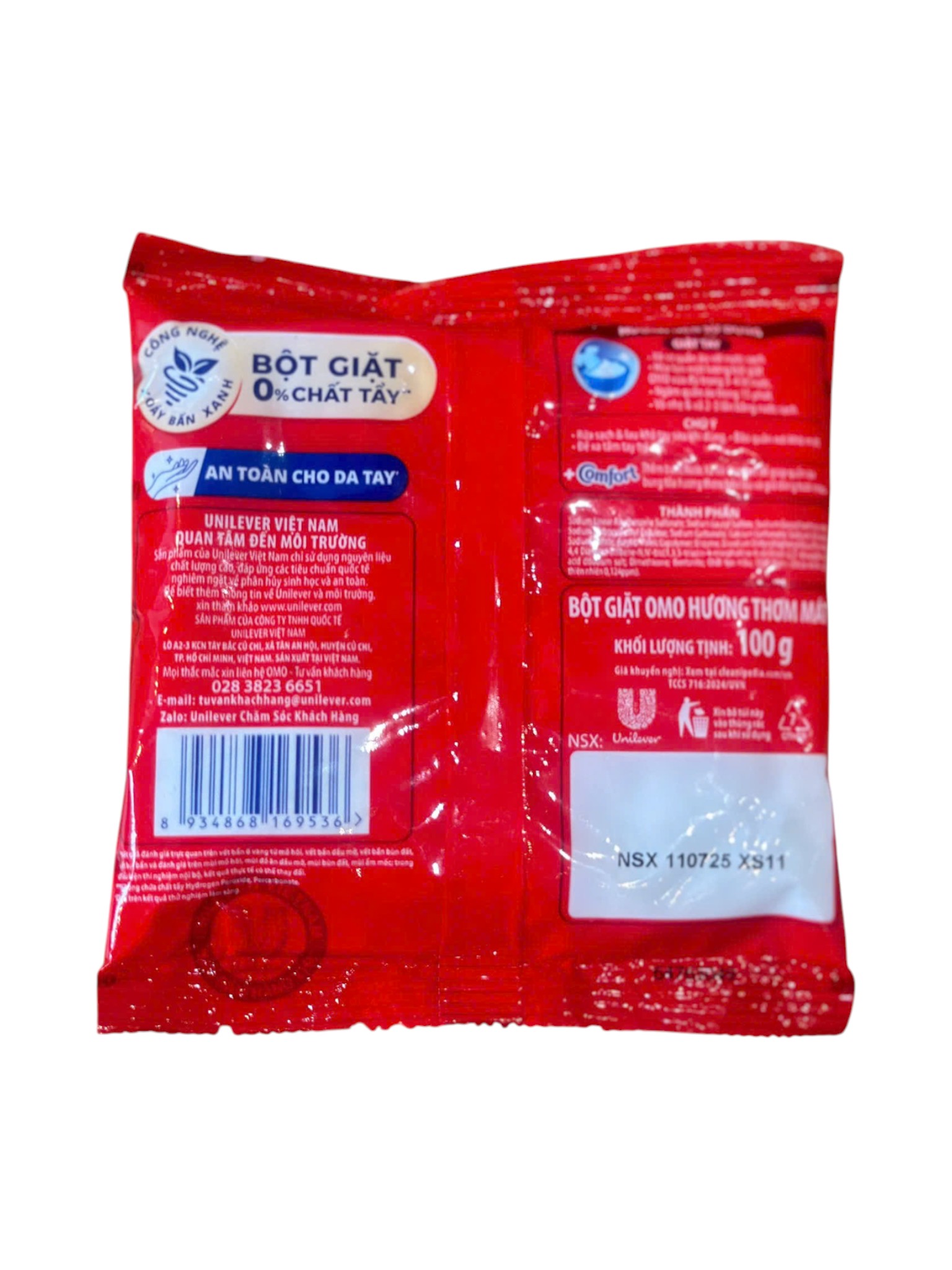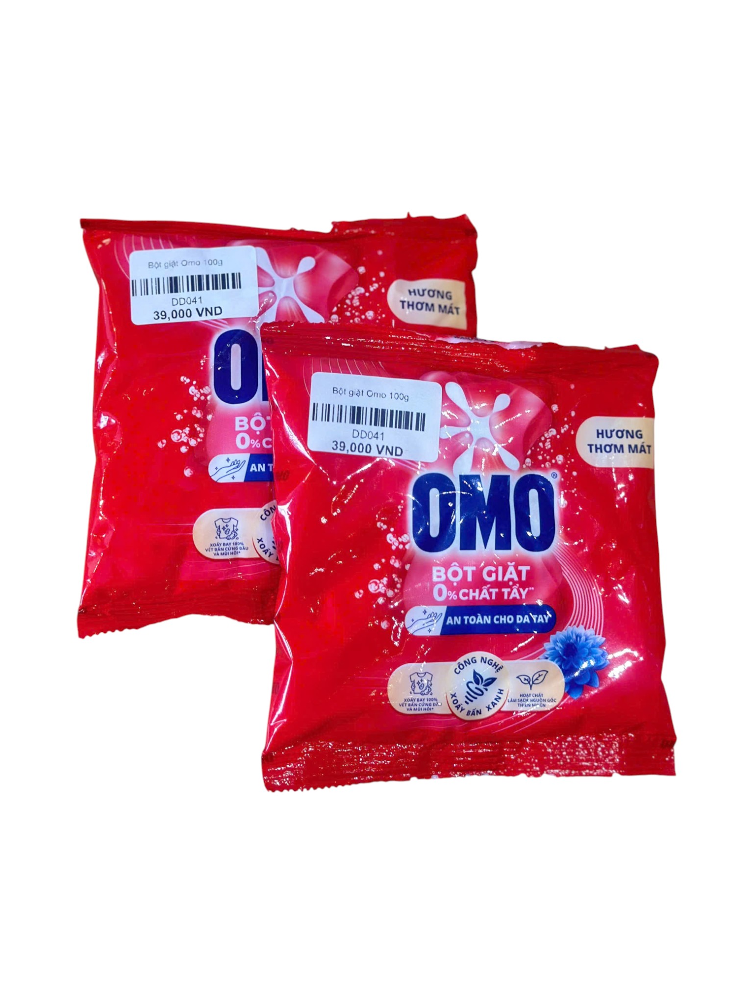 Bột giặt Omo 100g với công thức an toàn cho da tay, giúp làm sạch và sáng quần áo hiệu quả mà không gây kích ứng. Sản phẩm dễ dàng hòa tan trong nước, mang đến hương thơm mát dễ chịu, giúp quần áo luôn sạch sẽ và thơm tho. Thích hợp cho việc