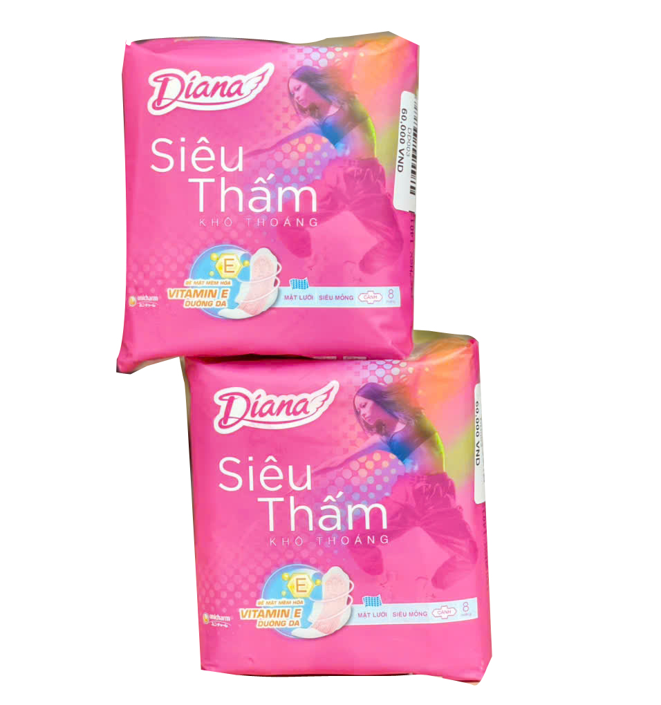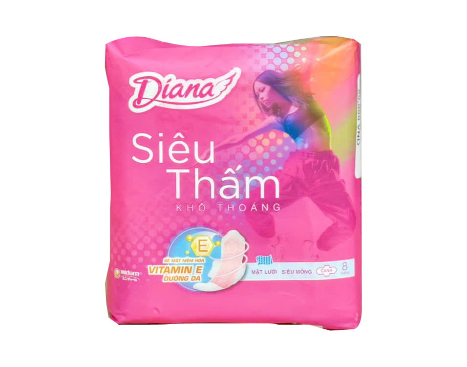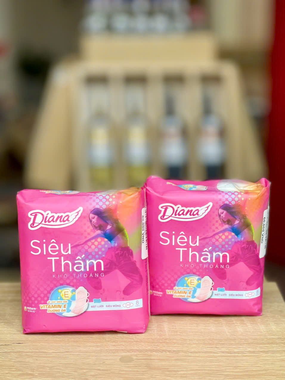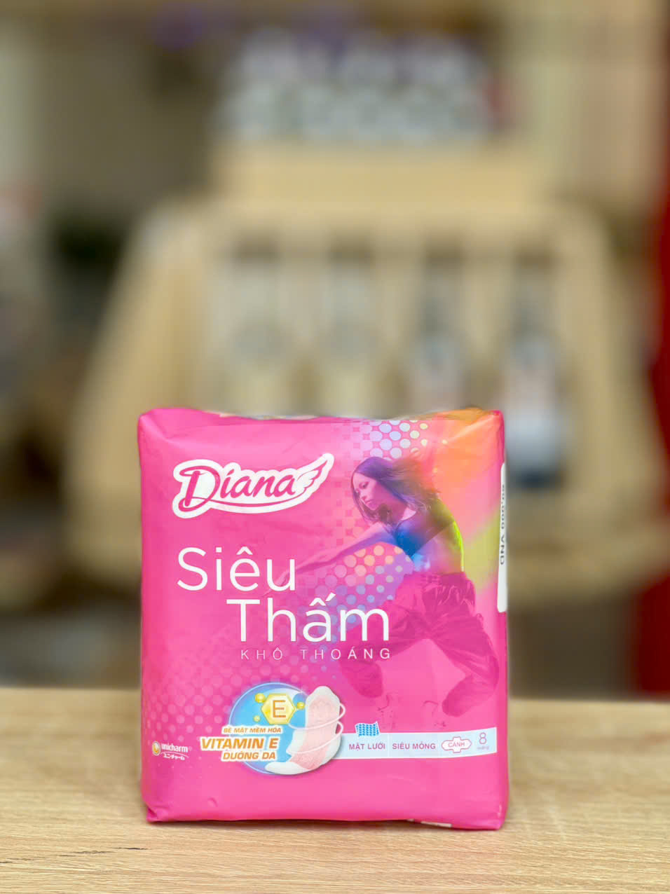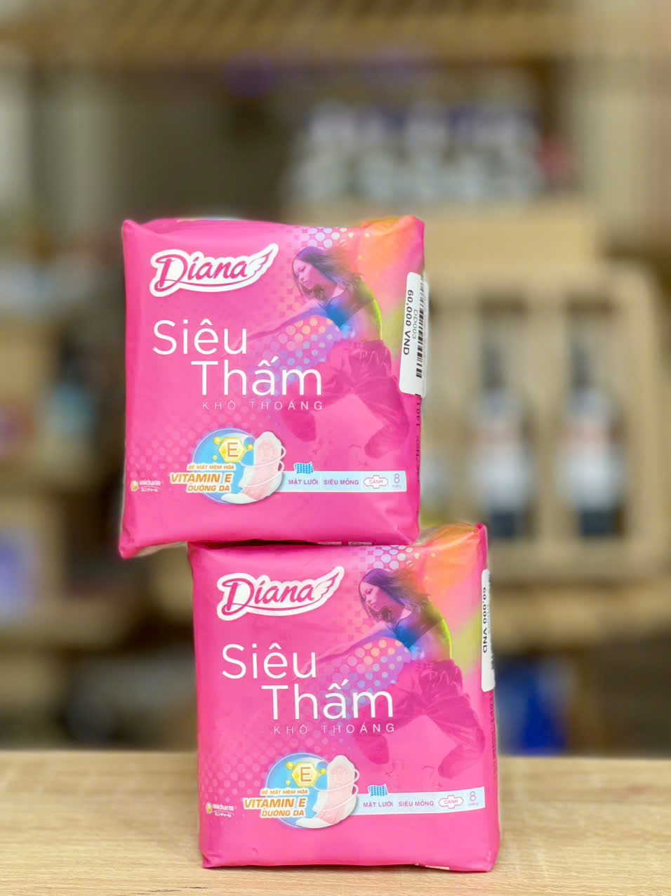 Băng vệ sinh Diana Siêu Thấm Khô Thoáng với lõi siêu thấm giúp hút nhanh và chống tràn hiệu quả, mang lại cảm giác khô ráo dài lâu.