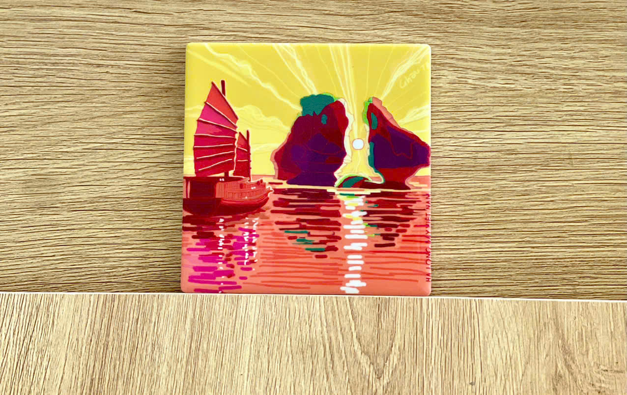 Ceramic Square Coaster 3D – Hạ Long được làm từ gốm cao cấp, in hình 3D sống động khắc họa vẻ đẹp hùng vĩ của Vịnh Hạ Long. Bề mặt chống thấm nước, chịu nhiệt tốt, giúp bảo vệ bàn khỏi vết ố và trầy xước. Vừa tiện lợi trong sinh hoạt, vừa là món quà lưu niệm ý nghĩa mang đậm dấu ấn Việt Nam.