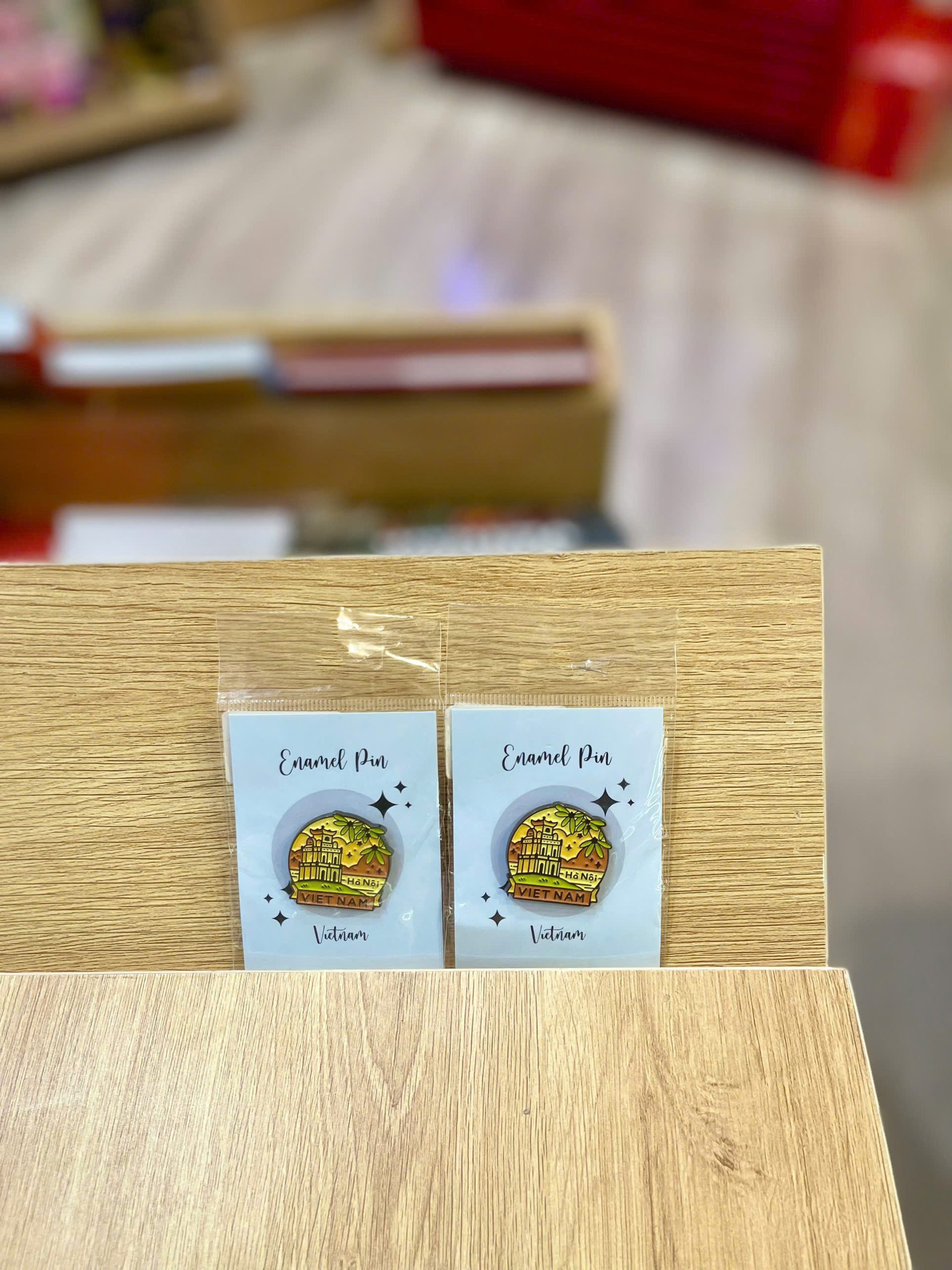 Ghim cài áo (Enamel Pin) được thiết kế chi tiết, mô tả cảnh quan mang tính biểu tượng của Hồ Hoàn Kiếm tại Hà Nội. Họa tiết nổi bật với hình ảnh Tháp Rùa trên đảo nhỏ, cùng với các yếu tố khác thể hiện nét duyên dáng độc đáo của thành phố, kèm theo chữ "HÀ NỘI" và "VIET NAM". Đây là một phụ kiện hoặc món quà lưu niệm hoàn hảo để gợi nhớ về thủ đô của Việt Nam.