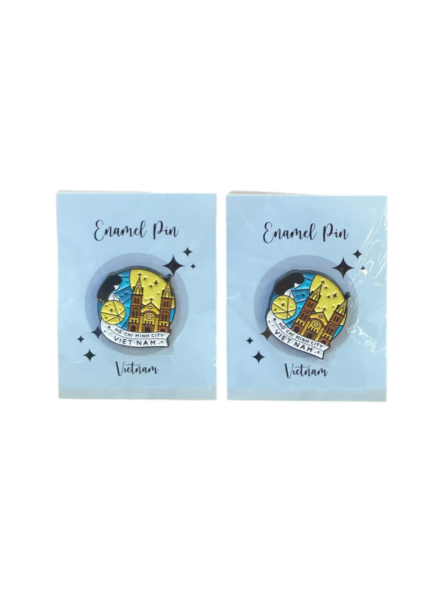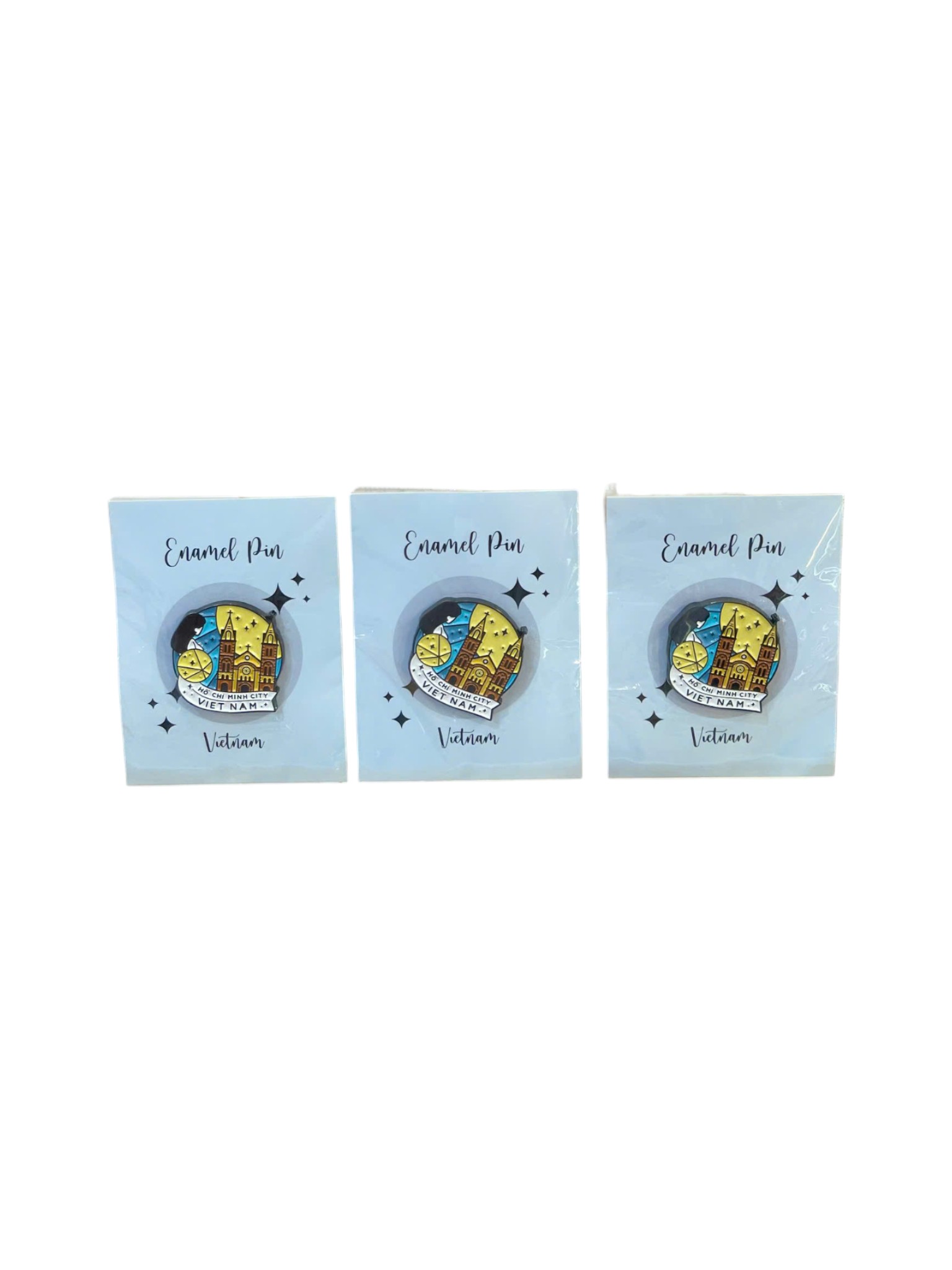 Ghim cài áo (Enamel Pin) được thiết kế chi tiết, mô tả cảnh quan mang tính biểu tượng của Hồ Hoàn Kiếm tại Hà Nội. Họa tiết nổi bật với hình ảnh Tháp Rùa trên đảo nhỏ, cùng với các yếu tố khác thể hiện nét duyên dáng độc đáo của thành phố, kèm theo chữ "HÀ NỘI" và "VIET NAM". Đây là một phụ kiện hoặc món quà lưu niệm hoàn hảo để gợi nhớ về thủ đô của Việt Nam.