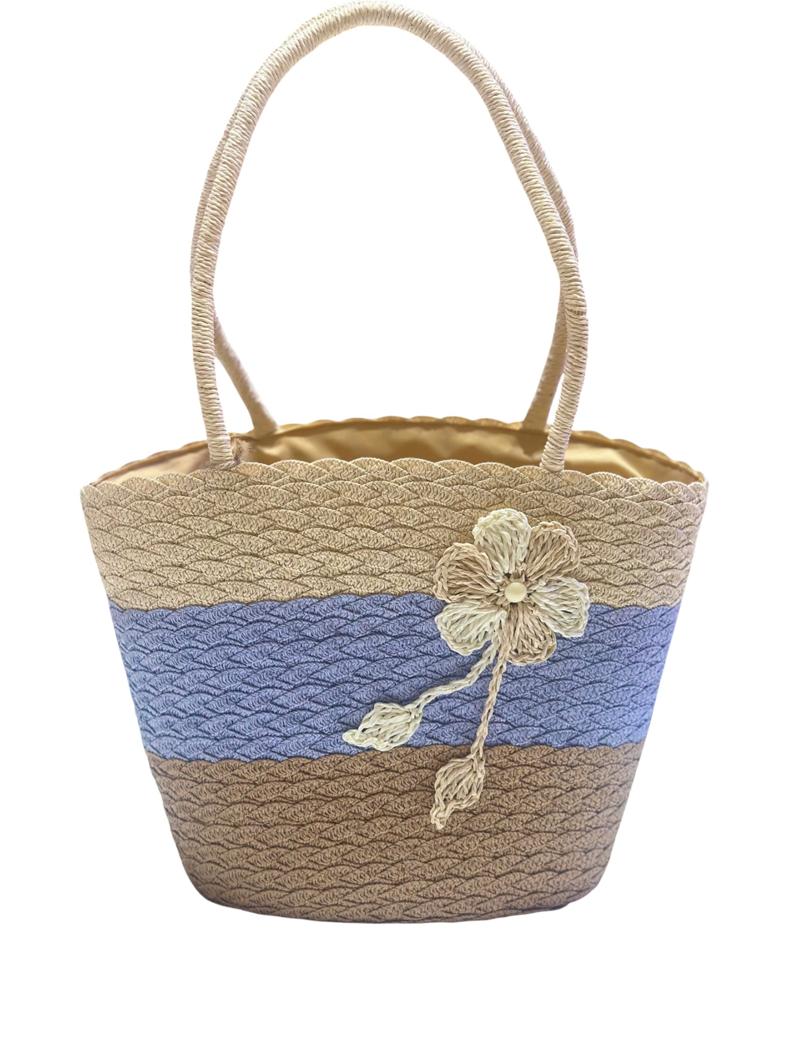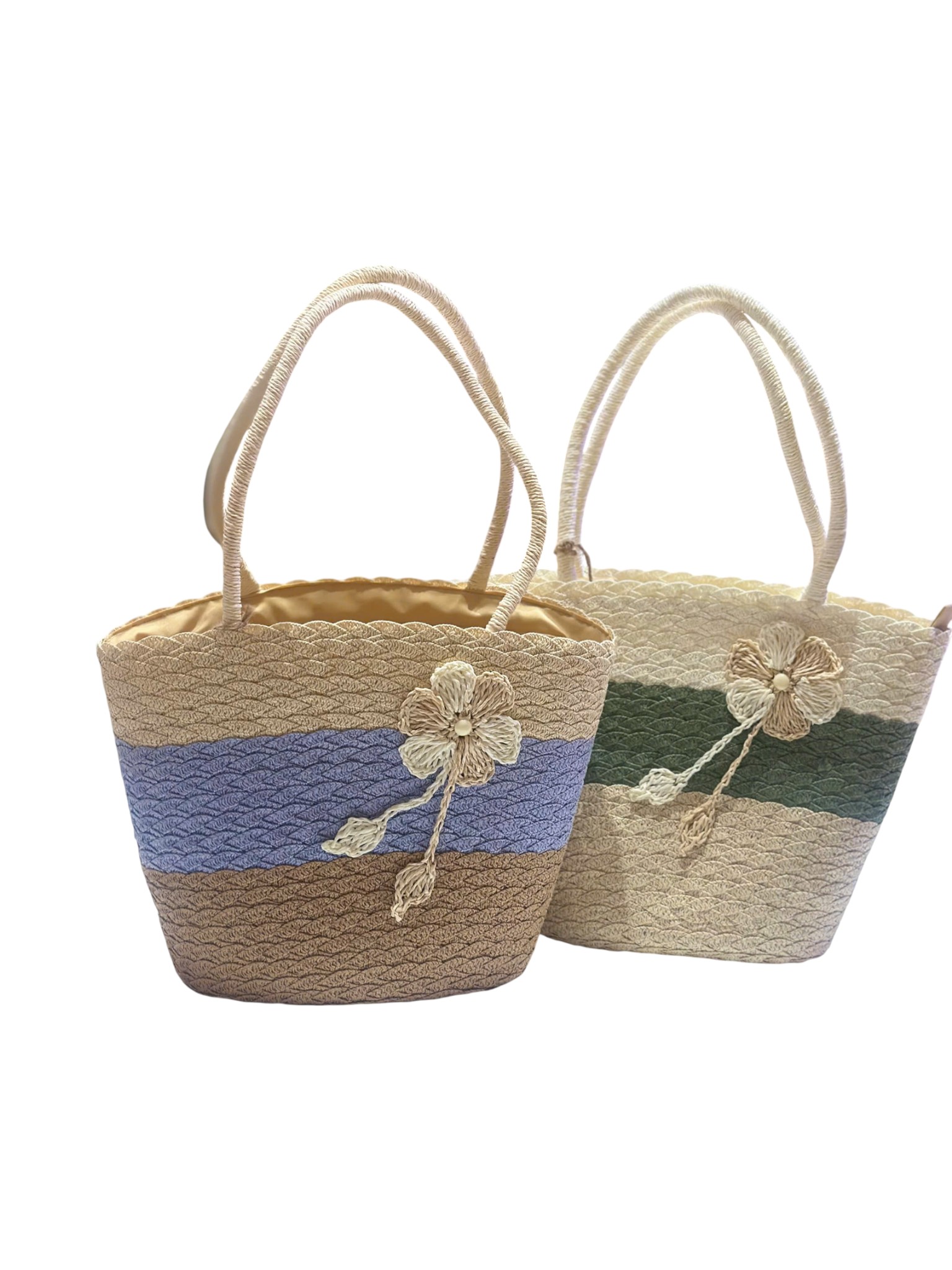 Là chiếc túi cói/rơm dệt thủ công cỡ lớn, màu be nhạt, có quai xách tết bím, được trang trí bằng họa tiết hoa lớn (có thể là hoa cúc hoặc hoa vải đỏ) và có thể có hình con ong đính kèm.
