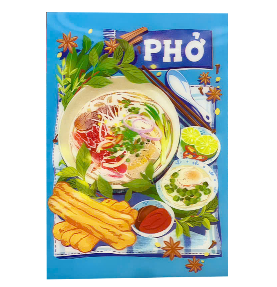 HL_Postcard 3D – Phở Cuisine là bưu thiếp 3D pop-up độc đáo, tái hiện hình ảnh tô phở Việt Nam truyền thống – món ăn quốc hồn quốc túy được cả thế giới yêu thích. Khi mở ra, bưu thiếp hiện lên thiết kế 3D sống động, mang đến sự bất ngờ và thú vị cho người nhận.