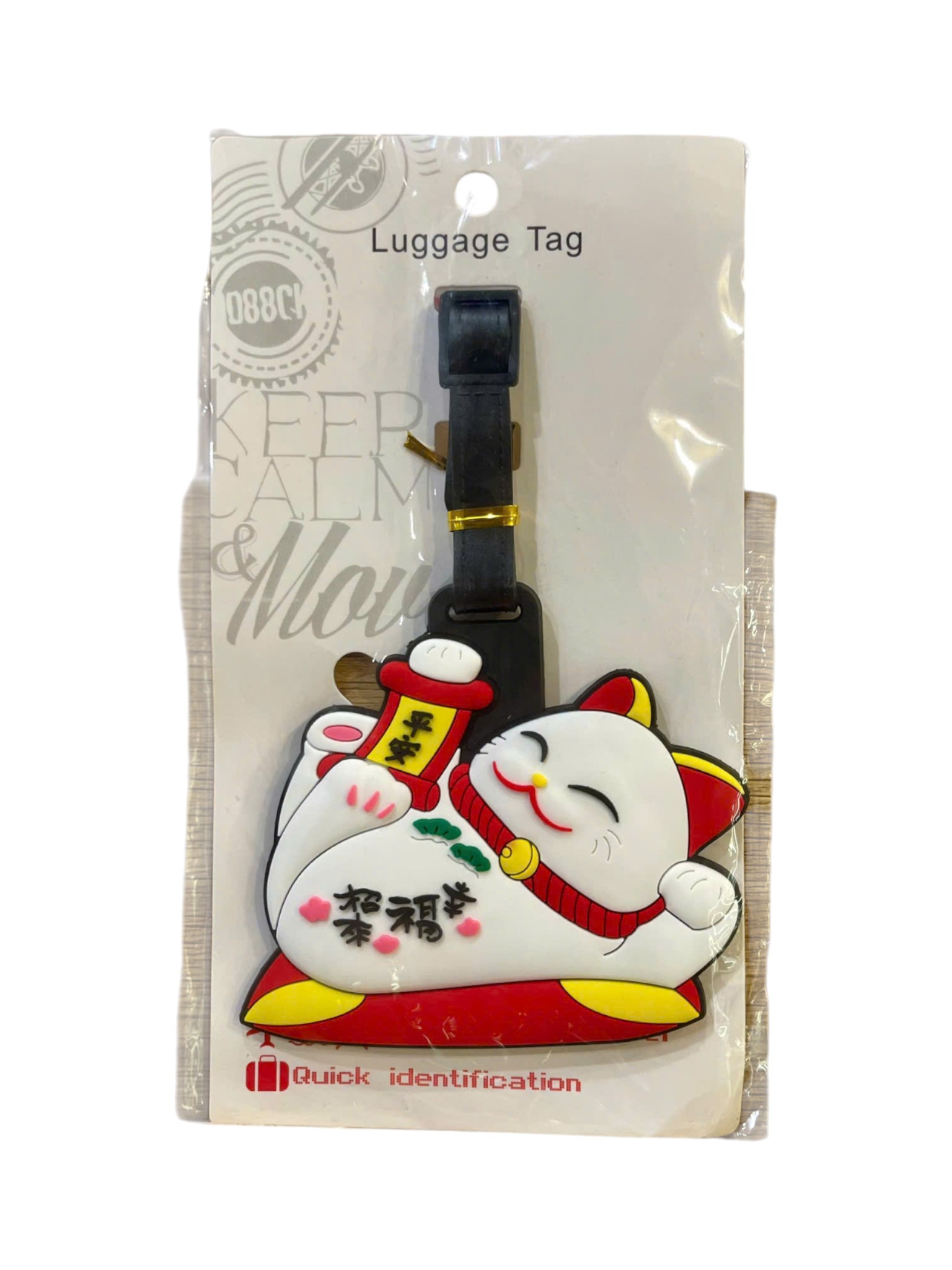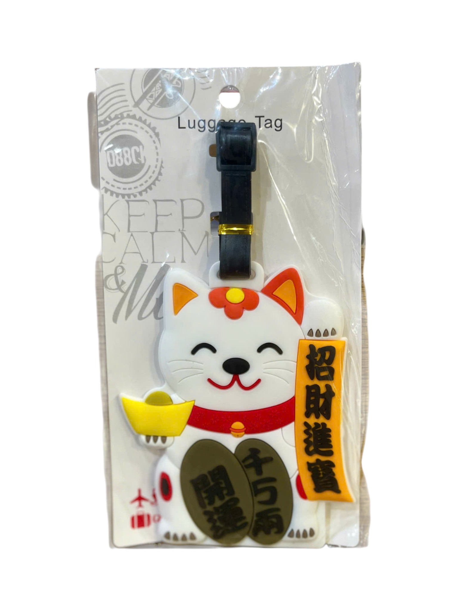 Thẻ có hình dáng chú Mèo Thần Tài với khuôn mặt cười tươi, một tay cầm thỏi vàng (kim nguyên bảo) và tay kia có thể là vẫy gọi (nhưng thẻ này đang ngồi). Màu sắc chủ đạo là trắng và đỏ, với chữ Hán ý nghĩa là "Chiêu Tài Tấn Bảo" (招財進寶 - rước tài lộc vào nhà) và "Khai Vận" (開運 - mở ra vận may) được in rõ ràng. Thiết kế mang lại cảm giác vui vẻ và may mắn, lý tưởng cho những chuyến đi làm ăn hoặc du lịch. Thẻ đi kèm với một dây đeo màu đen để gắn vào hành lý.