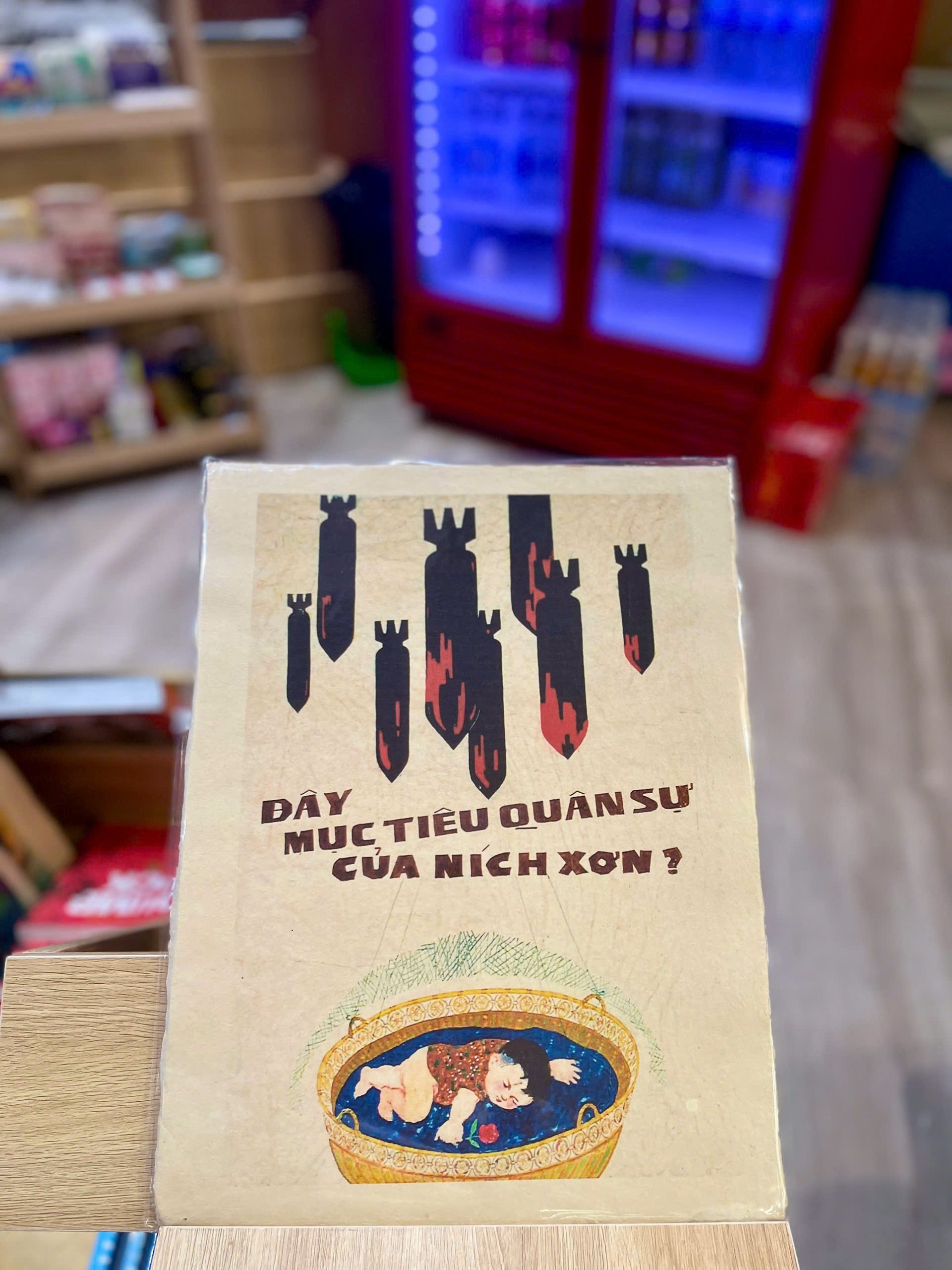 Tố cáo tội ác chiến tranh của Mỹ (dưới thời Tổng thống Nixon) đối với dân thường, đặc biệt là trẻ em Việt Nam Nhiều quả bom lớn màu đen, có vệt máu màu đỏ đen chảy dài, đang rơi xuống, tượng trưng cho sự tàn phá. Hình ảnh một em bé nhỏ (chắc khoảng sơ sinh) đang ngủ bình yên trong một chiếc nôi hoặc giỏ cói được trang trí. Dòng chữ lớn ở trung tâm là "ĐÂY MỤC TIÊU QUÂN SỰ CỦA NÍCH XƠN?" (Is this Nixon's military target?). Khẩu hiệu này đặt ra một câu hỏi đầy thách thức và lên án, sử dụng hình ảnh em bé vô tội để làm nổi bật sự vô nhân đạo của các cuộc ném bom. Nghệ thuật tuyên truyền mang tính tố cáo mạnh mẽ, sử dụng sự tương phản rõ rệt giữa bạo lực (bom đạn) và sự vô tội (em bé).