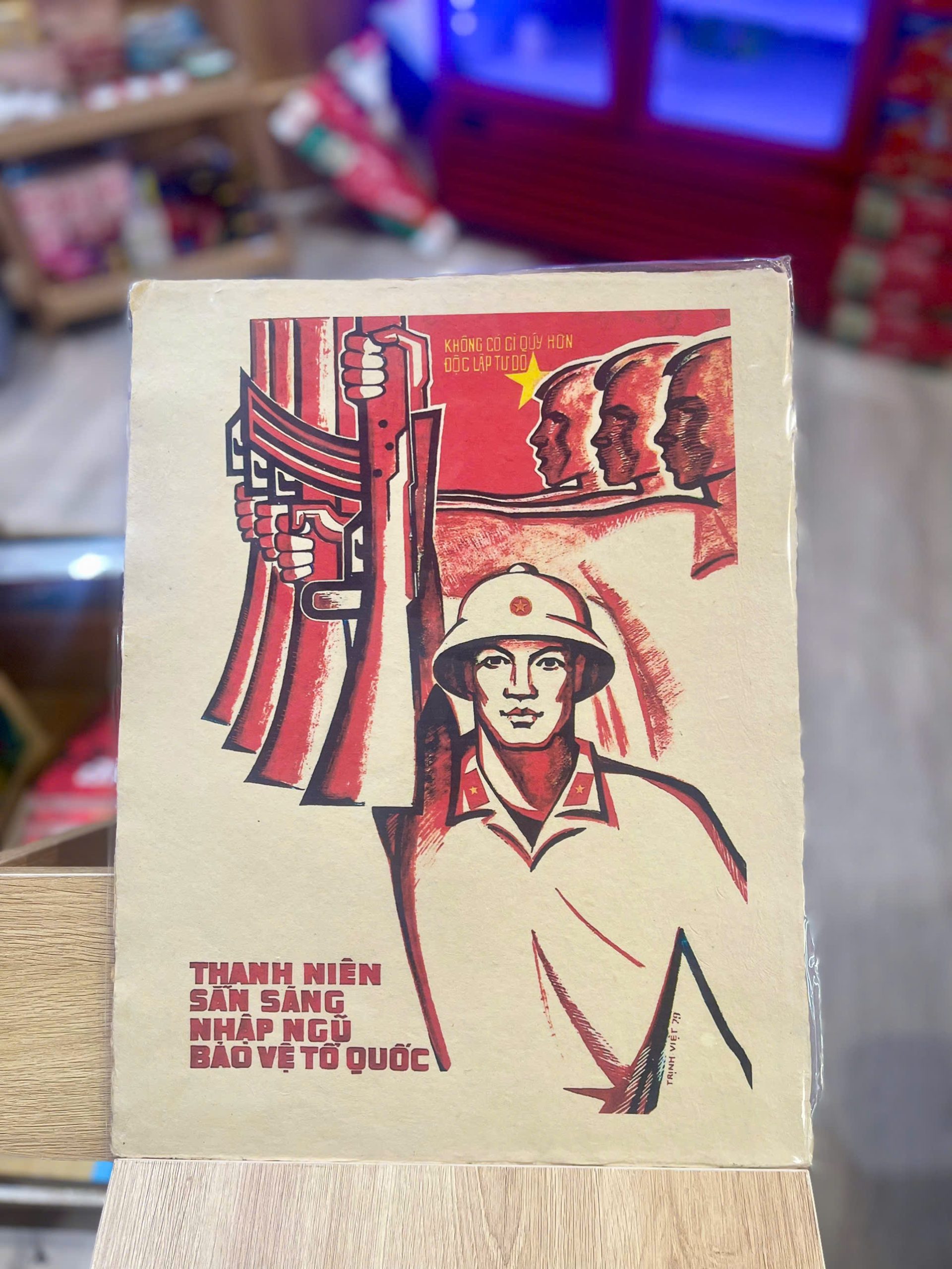 Kêu gọi thanh niên Việt Nam tham gia quân đội và sẵn sàng chiến đấu để bảo vệ Tổ quốc. Một thanh niên mặc quân phục, đội mũ cối/mũ sắt đặc trưng, với ánh mắt quyết tâm nhìn thẳng. Cánh tay phải anh giơ cao, và phía sau là hình ảnh một khẩu súng trường (có thể là AK) được tay trái giương lên, mạnh mẽ và dứt khoát. Phía trên bên phải là các khuôn mặt được xếp lớp, đại diện cho tập thể, quần chúng nhân dân hoặc những người lính khác, thể hiện sự đoàn kết và ủng hộ. "THANH NIÊN SẴN SÀNG NHẬP NGŨ BẢO VỆ TỔ QUỐC" (Youth are ready to enlist to defend the Fatherland). "KHÔNG CÓ GÌ QUÝ HƠN ĐỘC LẬP TỰ DO" (Nothing is more precious than independence and freedom), một câu nói nổi tiếng của Chủ tịch Hồ Chí Minh. Nghệ thuật đồ họa tuyên truyền mạnh mẽ, sử dụng tông màu đỏ và trắng (trên nền giấy ngà) tạo cảm giác khẩn trương và anh hùng.