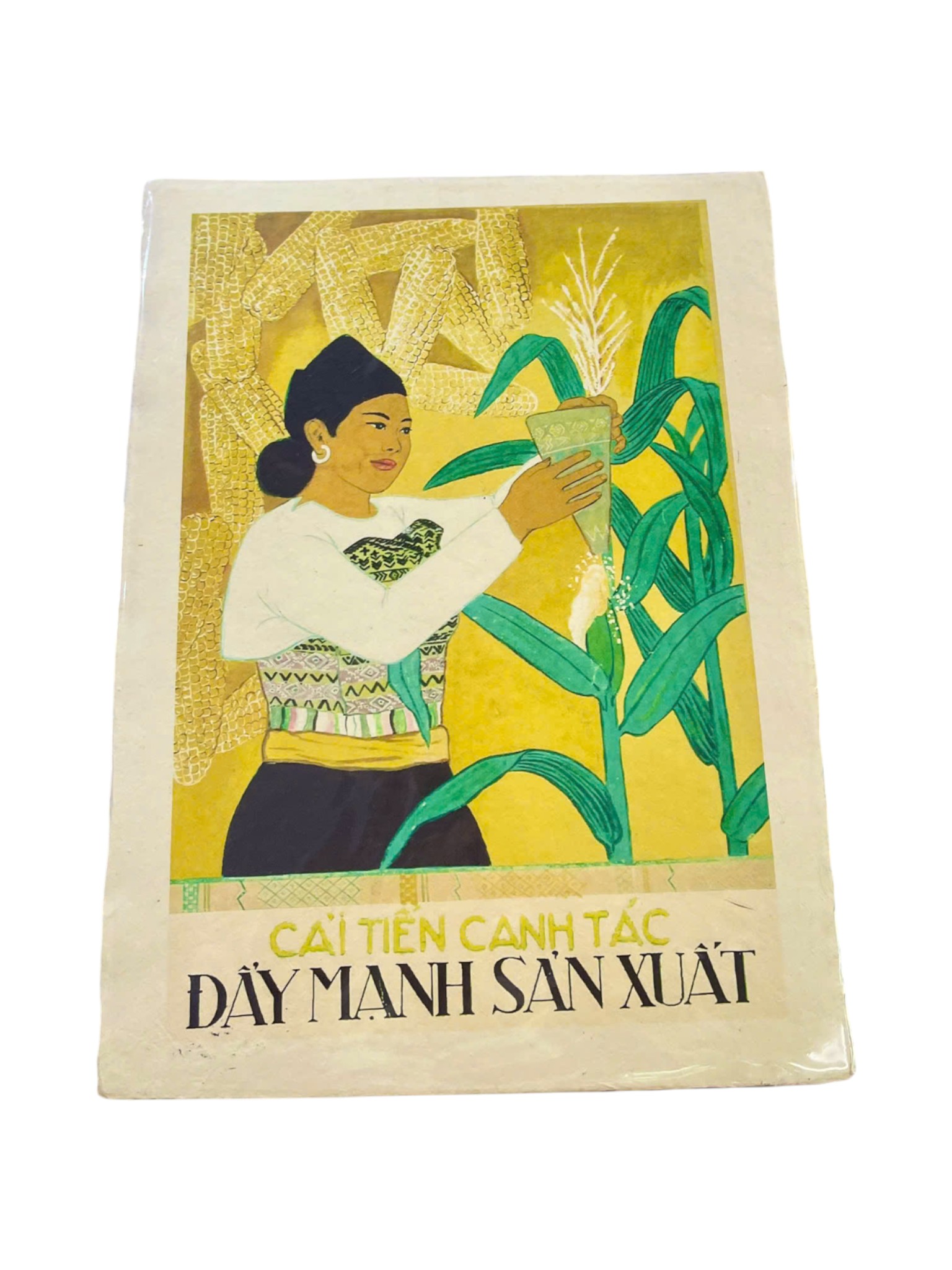 "Cải Tiến Canh Tác" Chủ đề: Thúc đẩy việc áp dụng kỹ thuật cải tiến canh tác để đẩy mạnh sản xuất nông nghiệp, cụ thể là cây ngô (bắp). Hình ảnh: Nhân vật: Một phụ nữ (có thể là người dân tộc thiểu số, dựa vào trang phục áo trắng và váy đen có họa tiết) đang đứng giữa cánh đồng ngô. Hoạt động: Cô đang kiểm tra hoặc chăm sóc một bắp ngô xanh non trên cây, với một tay che cho bắp. Xung quanh là những cây ngô cao lớn và những bắp ngô vàng đã chín rộ, tượng trưng cho vụ mùa bội thu. Thông điệp: Dòng chữ lớn dưới cùng là "CẢI TIẾN CANH TÁC ĐẨY MẠNH SẢN XUẤT" (Improve cultivation techniques, boost production). Đây là một khẩu hiệu khuyến khích khoa học hóa và hiện đại hóa nông nghiệp. Phong cách: Màu sắc tươi sáng, rực rỡ (vàng, xanh lá cây, trắng), sử dụng nét vẽ đơn giản nhưng biểu cảm, đặc trưng cho tranh tuyên truyền kinh tế.