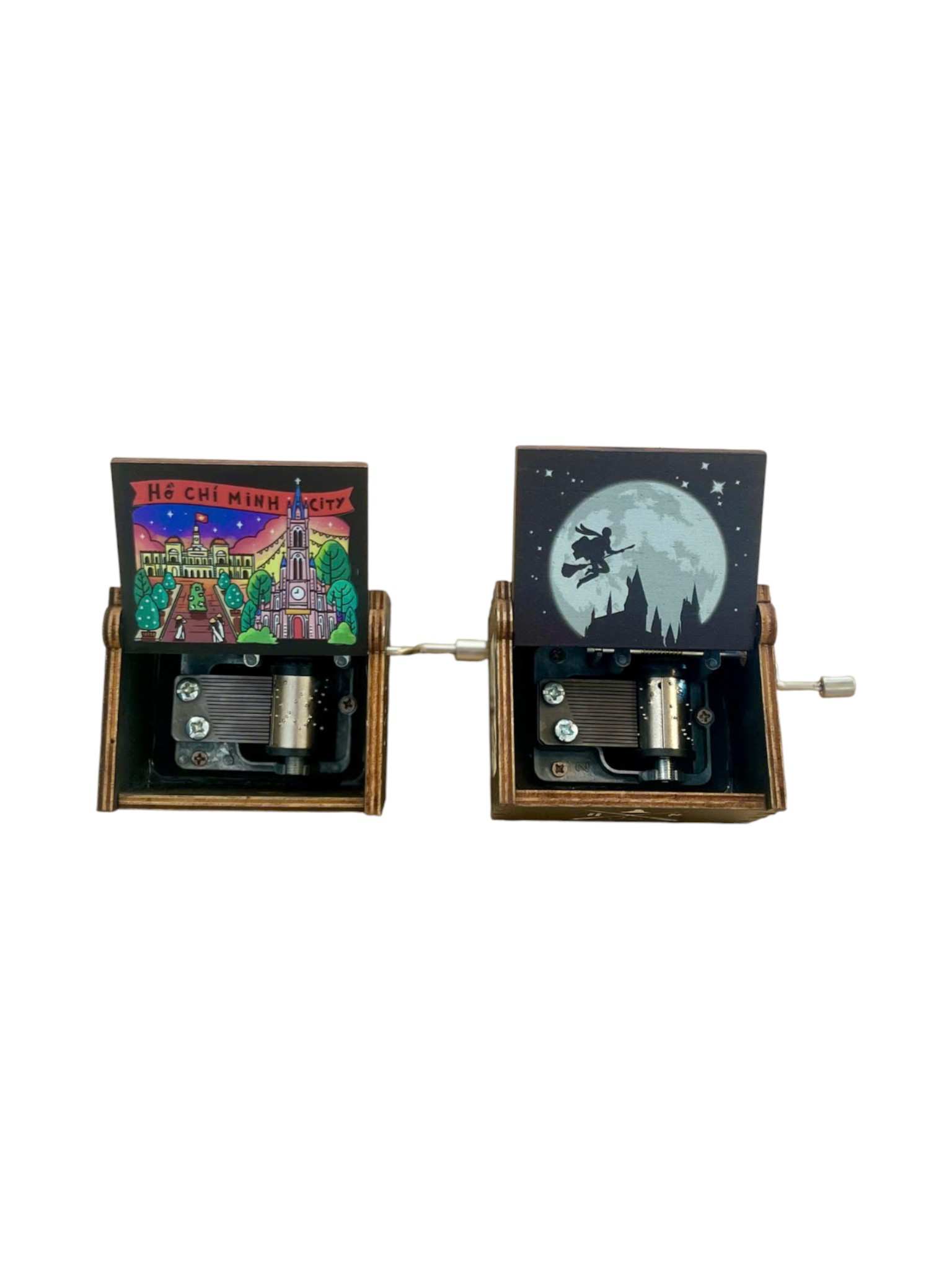 Tuyển tập hộp nhạc nhỏ xinh, được làm bằng gỗ, vận hành bằng cách quay tay, với cơ chế bên trong được để lộ. Hộp nhạc đi kèm các hình ảnh trang trí bằng giấy khác nhau ở mặt trong nắp hộp, thể hiện nhiều thiết kế ngộ nghĩnh hoặc chủ đề thành phố. Bạn cần tiếp tục quay cần để hộp nhạc phát ra giai điệu, biến đây thành món quà lưu niệm độc đáo, mang tính tương tác và cá nhân hóa.