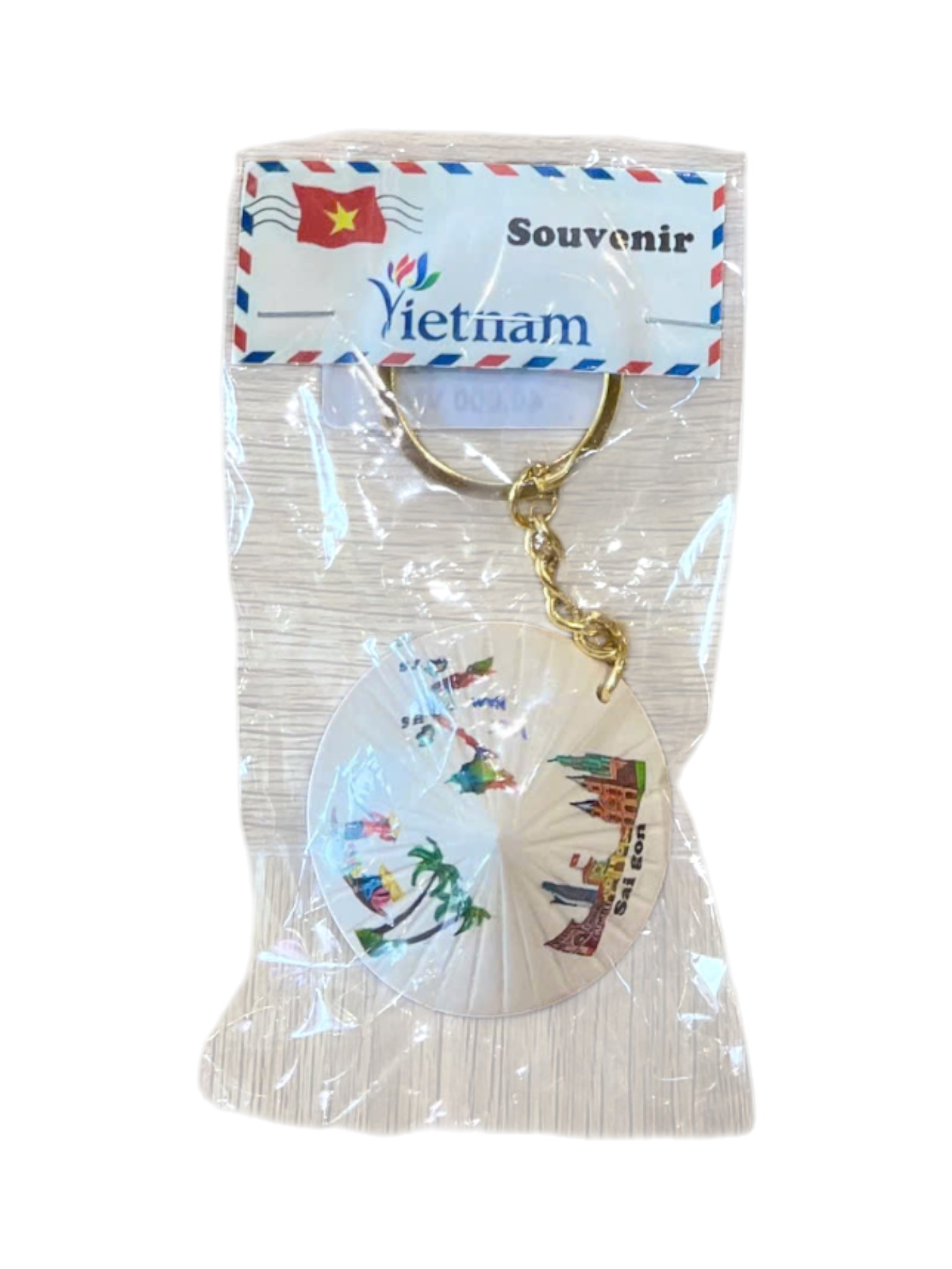 Móc khóa nhỏ nhắn, duyên dáng với thiết kế làm nổi bật hình ảnh chiếc nón lá truyền thống của Việt Nam. Thiết kế hình tròn, nền trắng, có lồng ghép hình ảnh nón lá cách điệu trên một khung cảnh đầy màu sắc, tượng trưng cho con người và cảnh sắc Việt Nam. Móc khóa được dán nhãn là "Souvenir Vietnam" (Quà lưu niệm Việt Nam), là món quà tặng hoặc vật kỷ niệm nhẹ nh