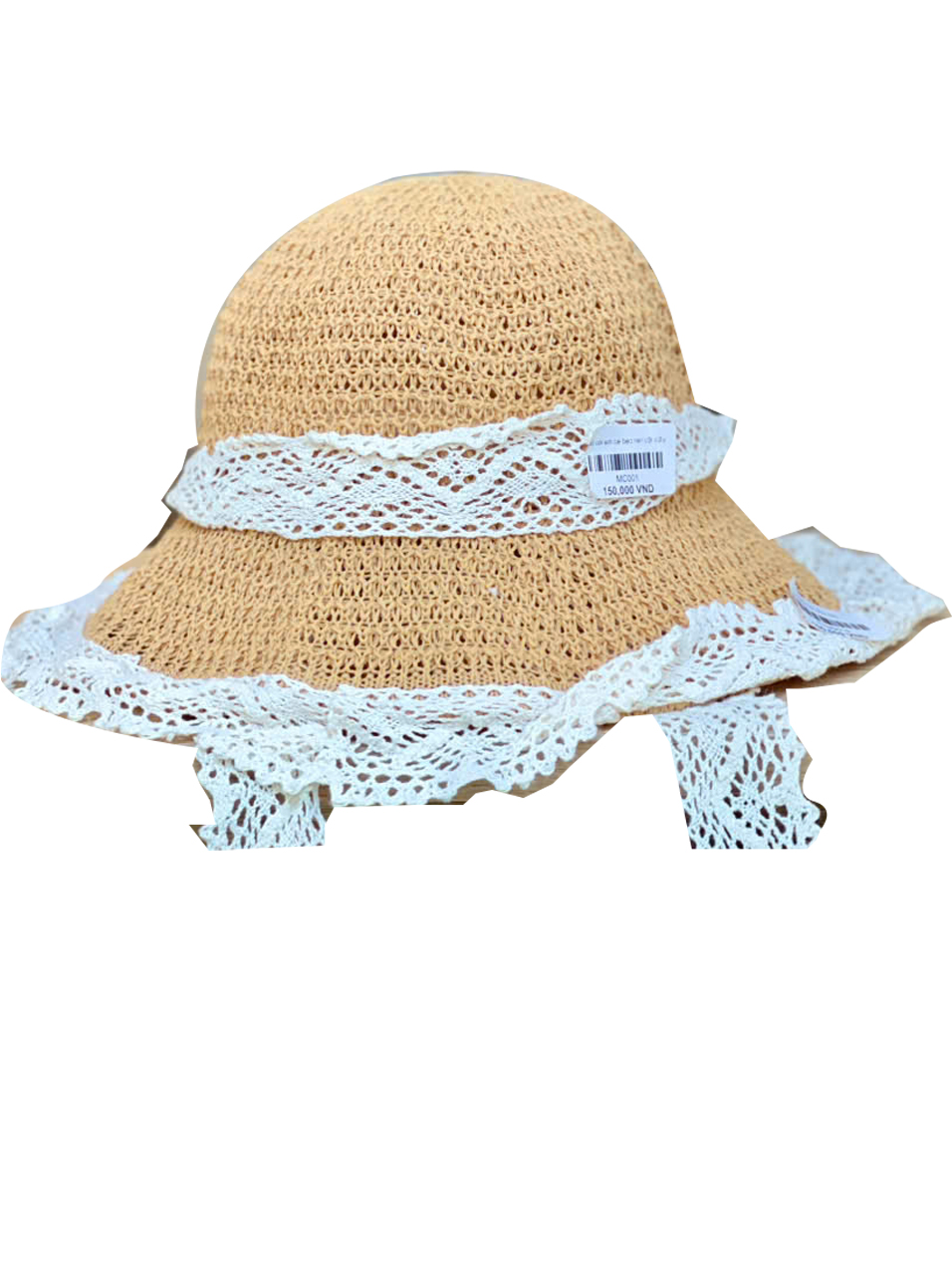 Kiểu dáng tròn xinh xắn, viền bèo ren trắng tinh tế, kèm dây buộc giúp cố định khi bé hoạt động.