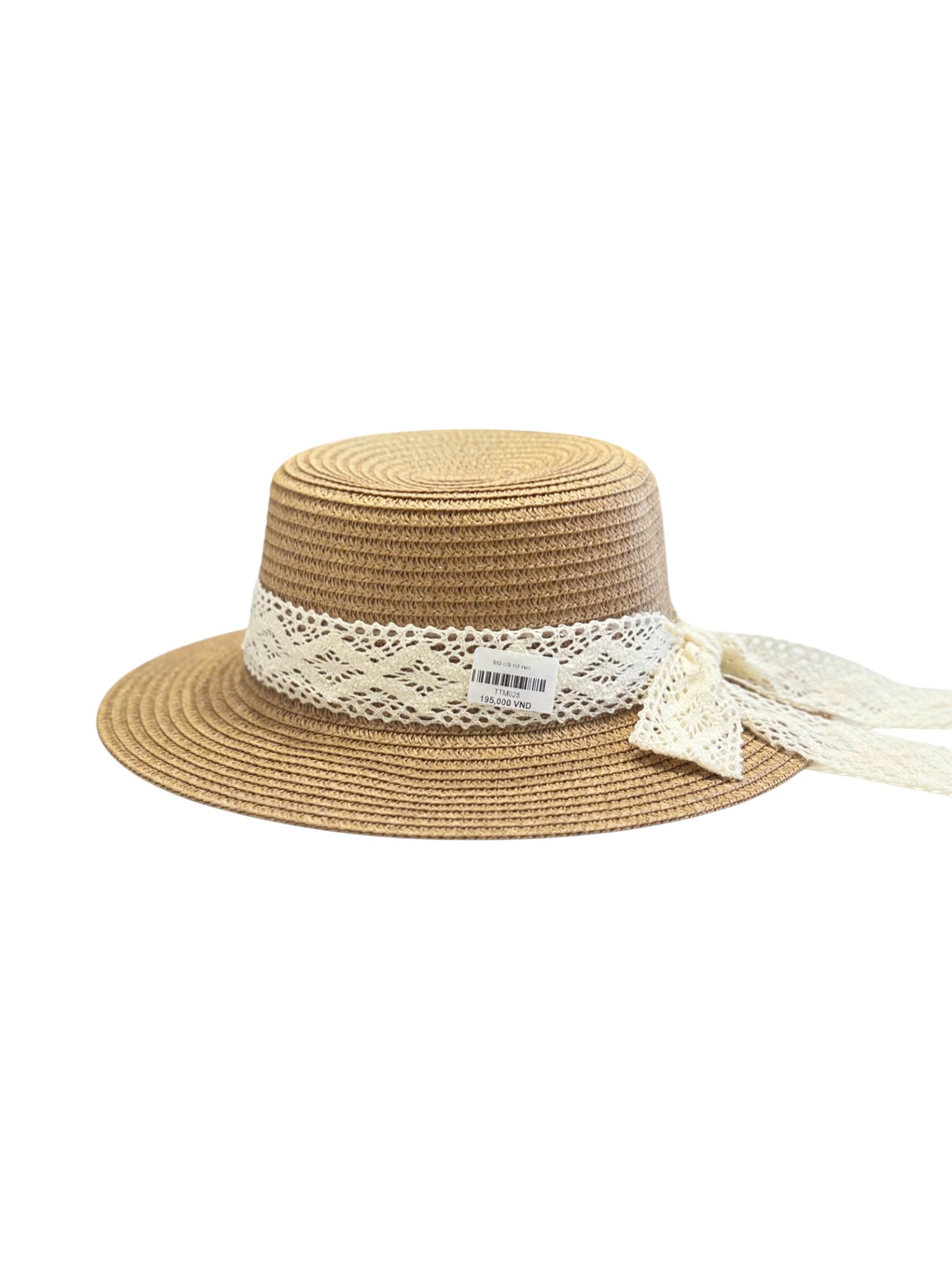 Mũ cói với nơ ren tinh tế mang đến vẻ ngoài nữ tính và thanh lịch. Sản phẩm có màu kem và nâu nhẹ nhàng, phù hợp cho những ngày nắng, dã ngoại hoặc chuyến đi thêm phần phong cách.