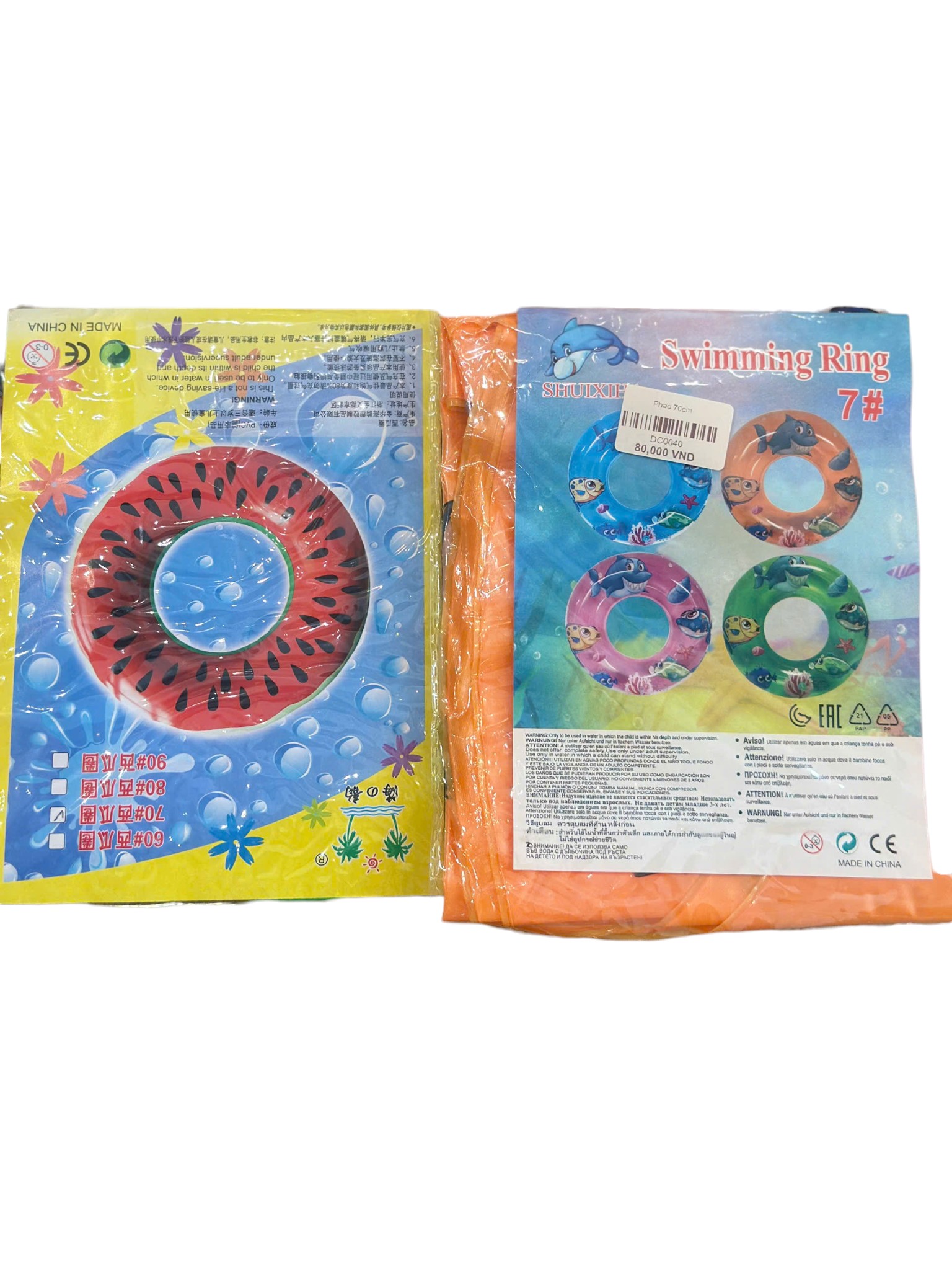 Phao có hình dạng vòng tròn, màu đỏ chủ đạo, với họa tiết giống lát dưa hấu (có các sọc xanh lá cây/xanh đen bên ngoài và các chấm đen như hạt dưa bên trong).Sản phẩm có ghi rõ "WARNING! This is not a life-saving device." (Đây không phải là thiết bị cứu sinh).