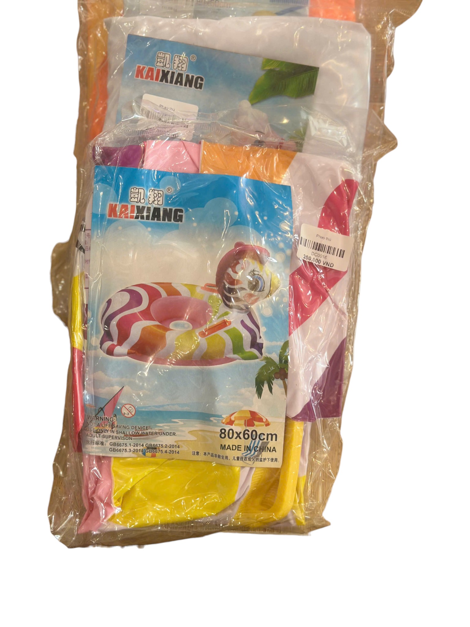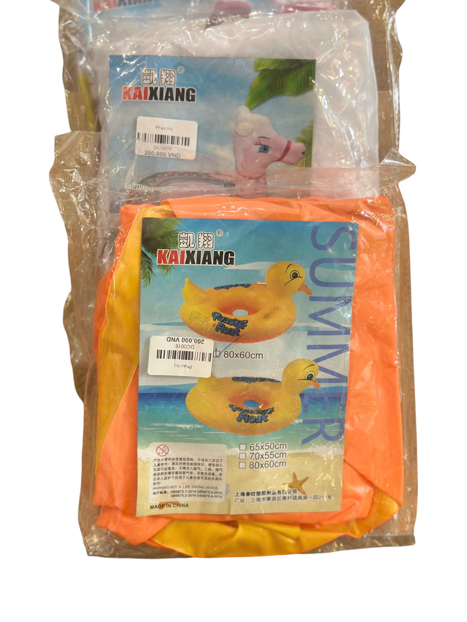 Là phao bơi bơm hơi hình con vịt màu vàng nổi bật của thương hiệu KAIXIANG, có nhiều kích thước (lên đến 80x60cm), và được cảnh báo rõ ràng là không phải thiết bị cứu sinh, phải dùng dưới sự giám sát của người lớn.