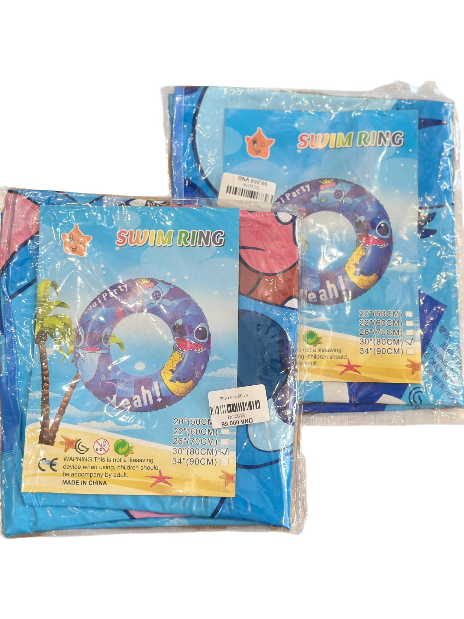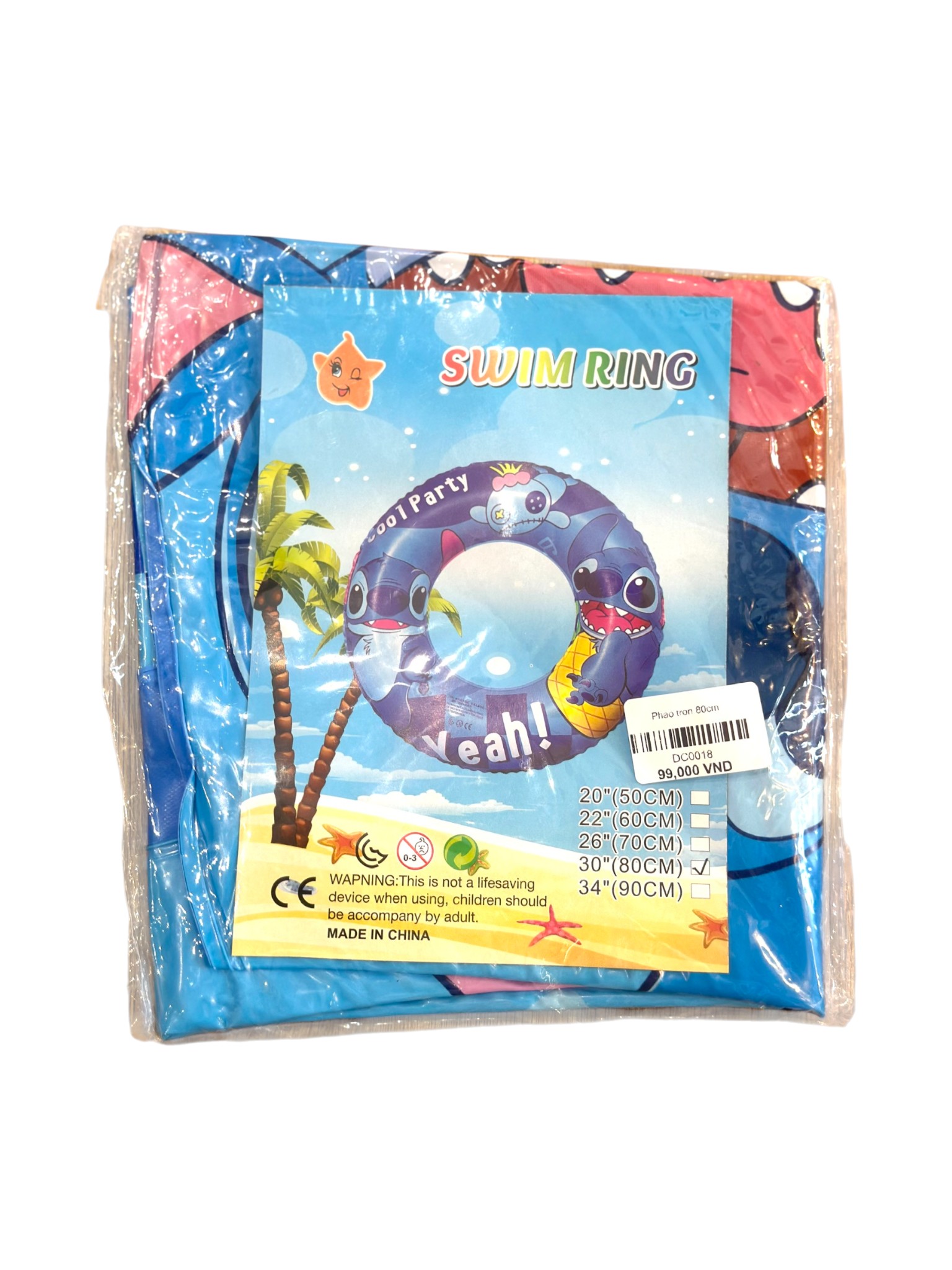 Là phao bơi bơm hơi hình vòng tròn kích thước 80cm (hoặc 30"), có nhiều họa tiết khác nhau (ví dụ: Dưa hấu, nhân vật hoạt hình Stitch) và được cảnh báo rõ ràng là không phải thiết bị cứu sinh, phải dùng dưới sự giám sát của người lớn.