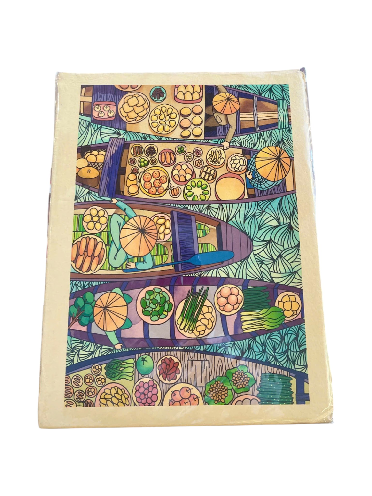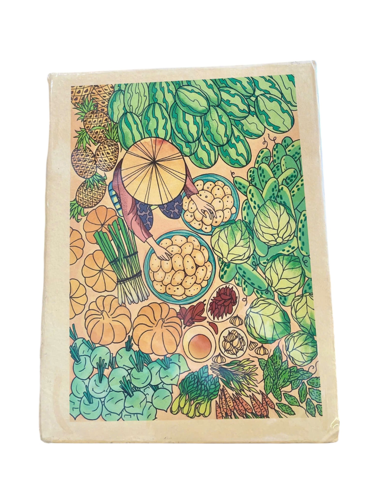 Bìa được làm bằng giấy Kraft màu nâu nhạt, tạo cảm giác mộc mạc. Hình ảnh là một bức tranh minh họa nghệ thuật với phong cách trừu tượng/hình học và màu sắc tươi sáng. Bức tranh mô tả cảnh chợ nổi (Floating Market), nơi các ghe/thuyền bán đầy trái cây và nông sản trên sông . Có hình ảnh người phụ nữ đội nón lá đang chèo thuyền, xung quanh là các sản phẩm đa dạng (chuối, dứa, hoa quả...) được sắp xếp đẹp mắt .