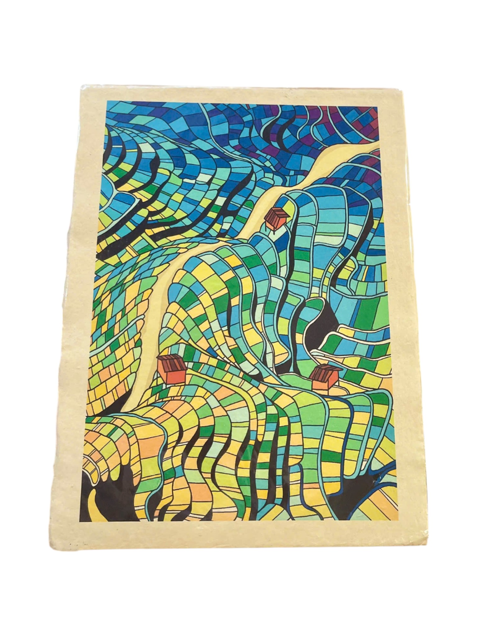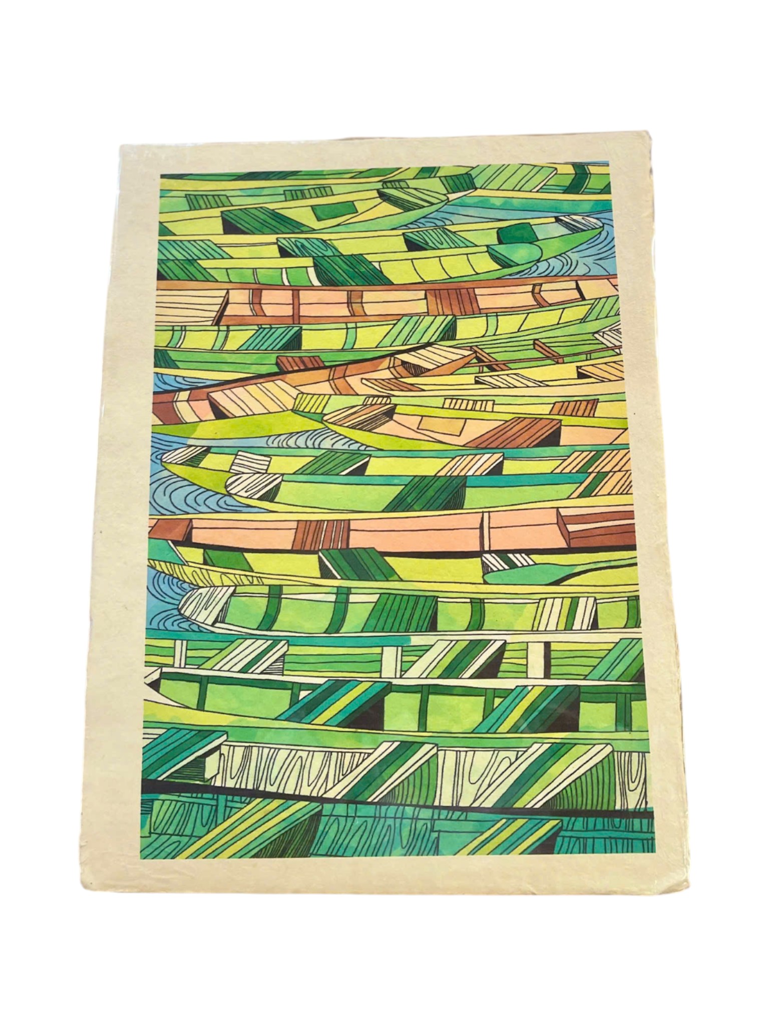 Poster trừu tượng phong cảnh cánh đồng lúa Việt Nam (Life in Vietnam_10). Tác phẩm sử dụng các mảng màu xanh lá đậm nhạt và các đường nét hình học, gợn sóng, gợi lên hình ảnh ruộng bậc thang hoặc cánh đồng lúa bát ngát. Thích hợp trang trí không gian nghệ thuật, mang đậm nét văn hóa nông thôn Việt Nam hiện đại.