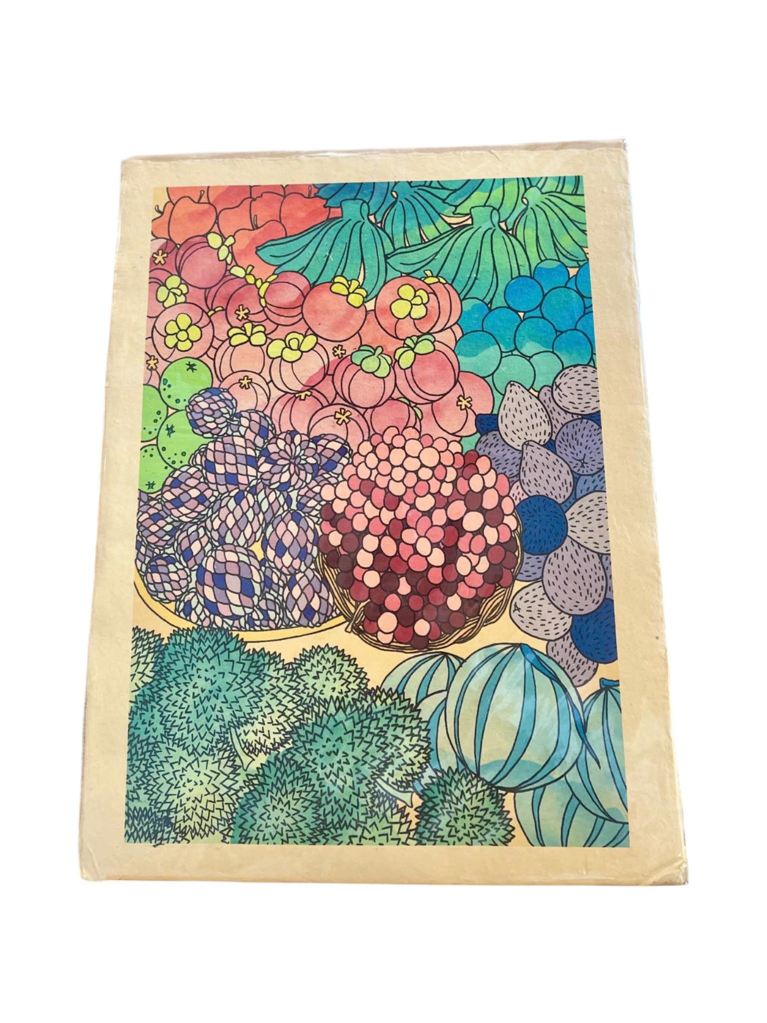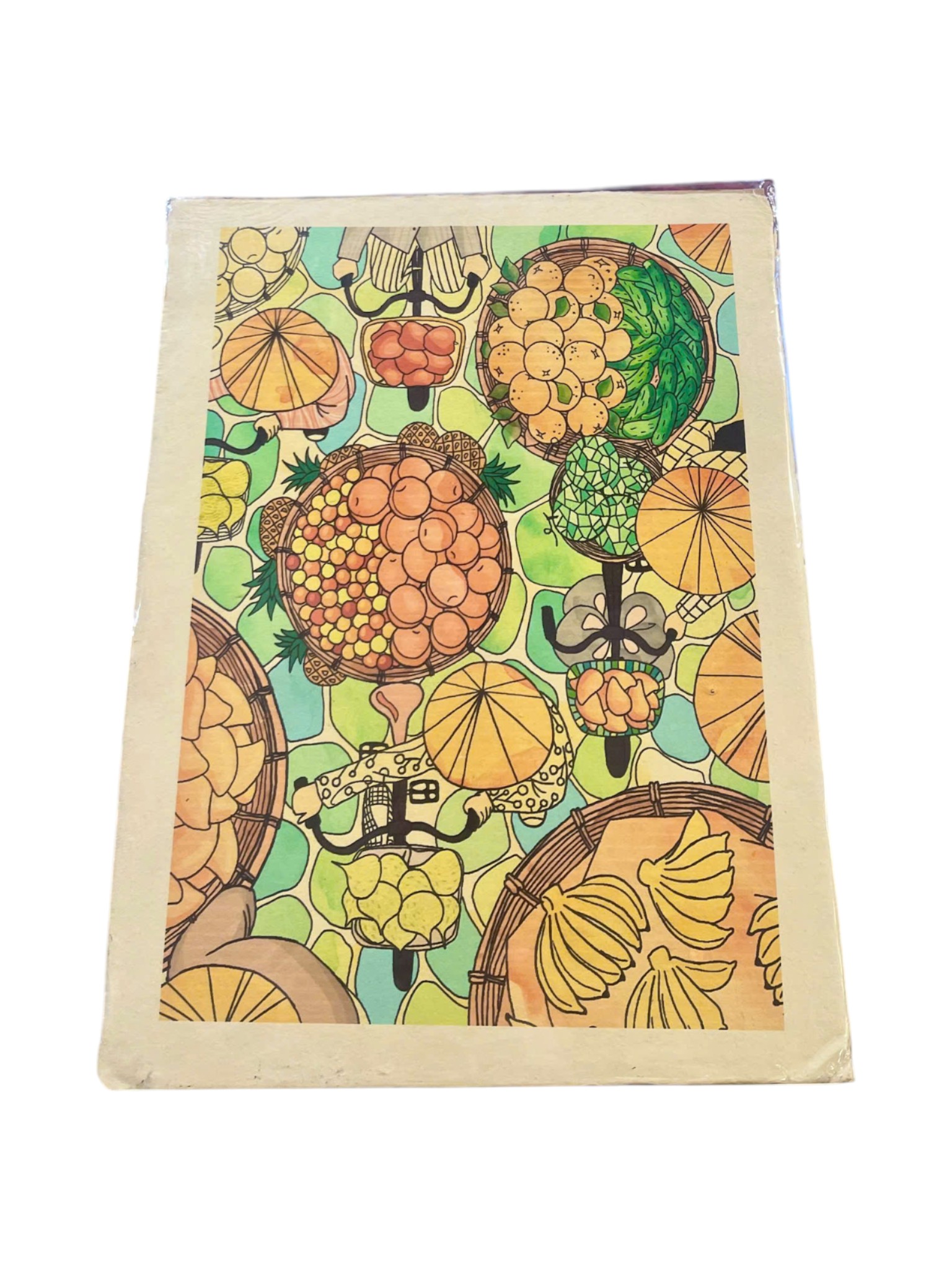 Poster nghệ thuật Chợ Trái Cây Việt Nam (Life in Vietnam_12), thuộc bộ sưu tập Life in Vietnam. Tác phẩm tái hiện sự phong phú và tươi mới của trái cây nhiệt đới Việt Nam (như vải, nho, dứa, v.v.) thông qua phong cách trừu tượng/hình học với các nét vẽ tinh tế. Bức tranh là một sự bùng nổ của màu sắc rực rỡ (hồng, xanh dương, xanh lá) trên nền giấy be nhạt, mang đến cái nhìn cận cảnh về một khía cạnh văn hóa và cuộc sống hàng ngày của người Việt. Poster được in trên chất liệu Giấy Dó truyền thống.