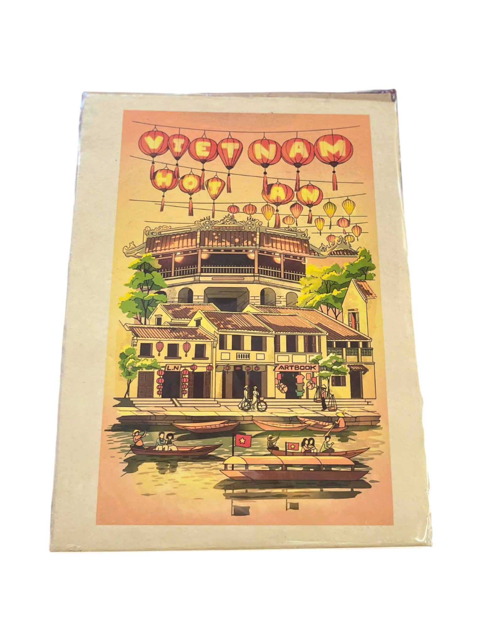Tấm áp phích (poster) có phong cách Art Nouveau rực rỡ, ghi lại ánh hoàng hôn ấm áp trên Phố cổ Hội An. Thiết kế lấy cảm hứng cổ điển, nổi bật với kiến trúc mang tính biểu tượng của phố cổ, dòng sông với những chiếc thuyền gỗ, và vô số đèn lồng truyền thống tạo thành chữ "VIET NAM" và "HOI AN". Được in trên chất liệu giấy mang cảm giác cổ kính, tác phẩm nghệ thuật độc đáo này là vật trang trí hoặc quà lưu niệm tuyệt vời, lưu giữ vẻ đẹp nên thơ của Hội An.