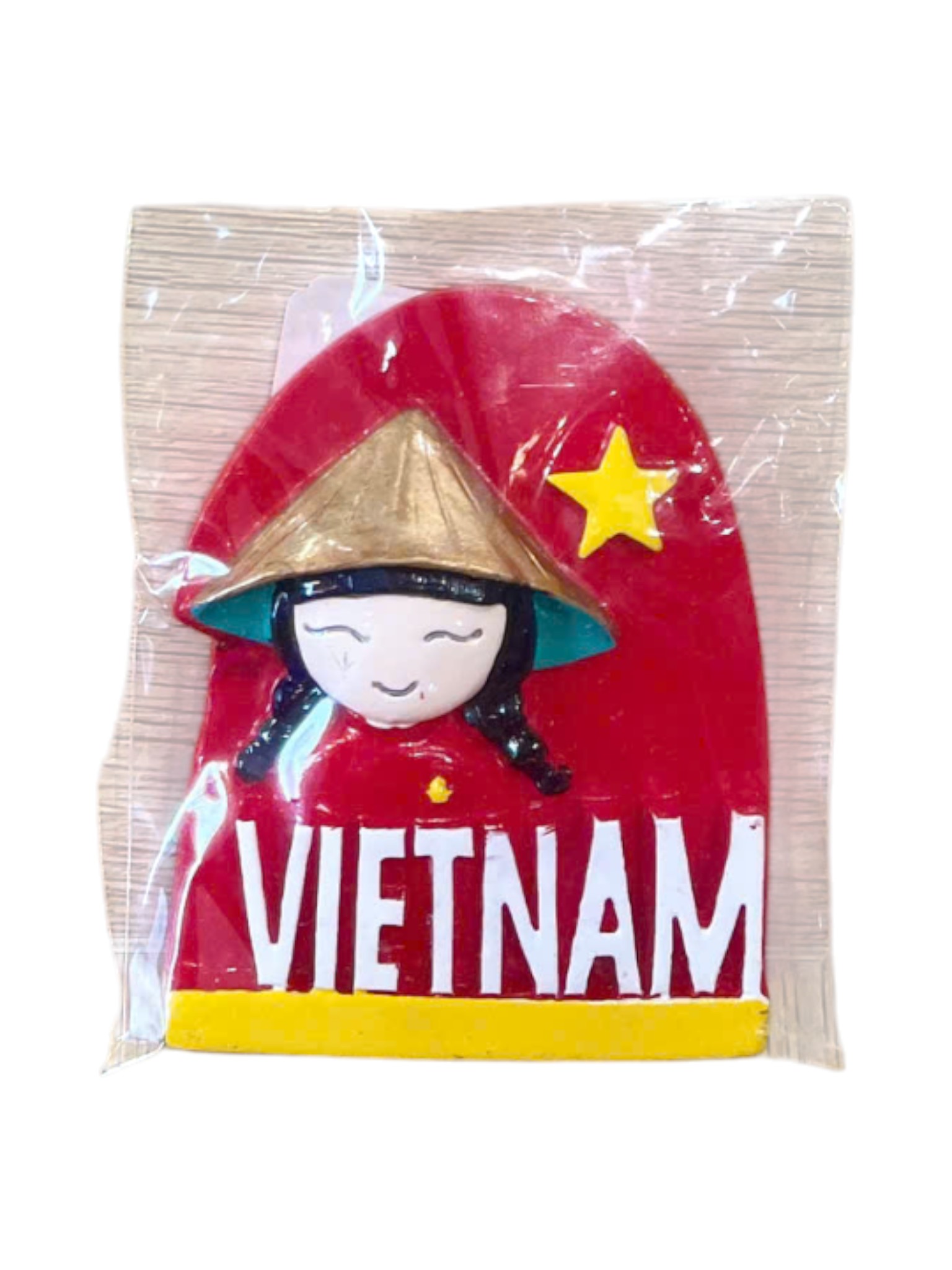 Nam châm rực rỡ và duyên dáng, nổi bật với hình ảnh cô gái Việt Nam cổ điển đội Nón Lá trên nền đỏ và vàng được lấy cảm hứng từ Quốc kỳ Việt Nam. Thiết kế hoạt hình dễ thương, cách điệu và có in chữ "VIETNAM". Đây là một món quà lưu niệm nhỏ hoặc vật trang trí hoàn hảo để tôn vinh văn hóa Việt Nam.