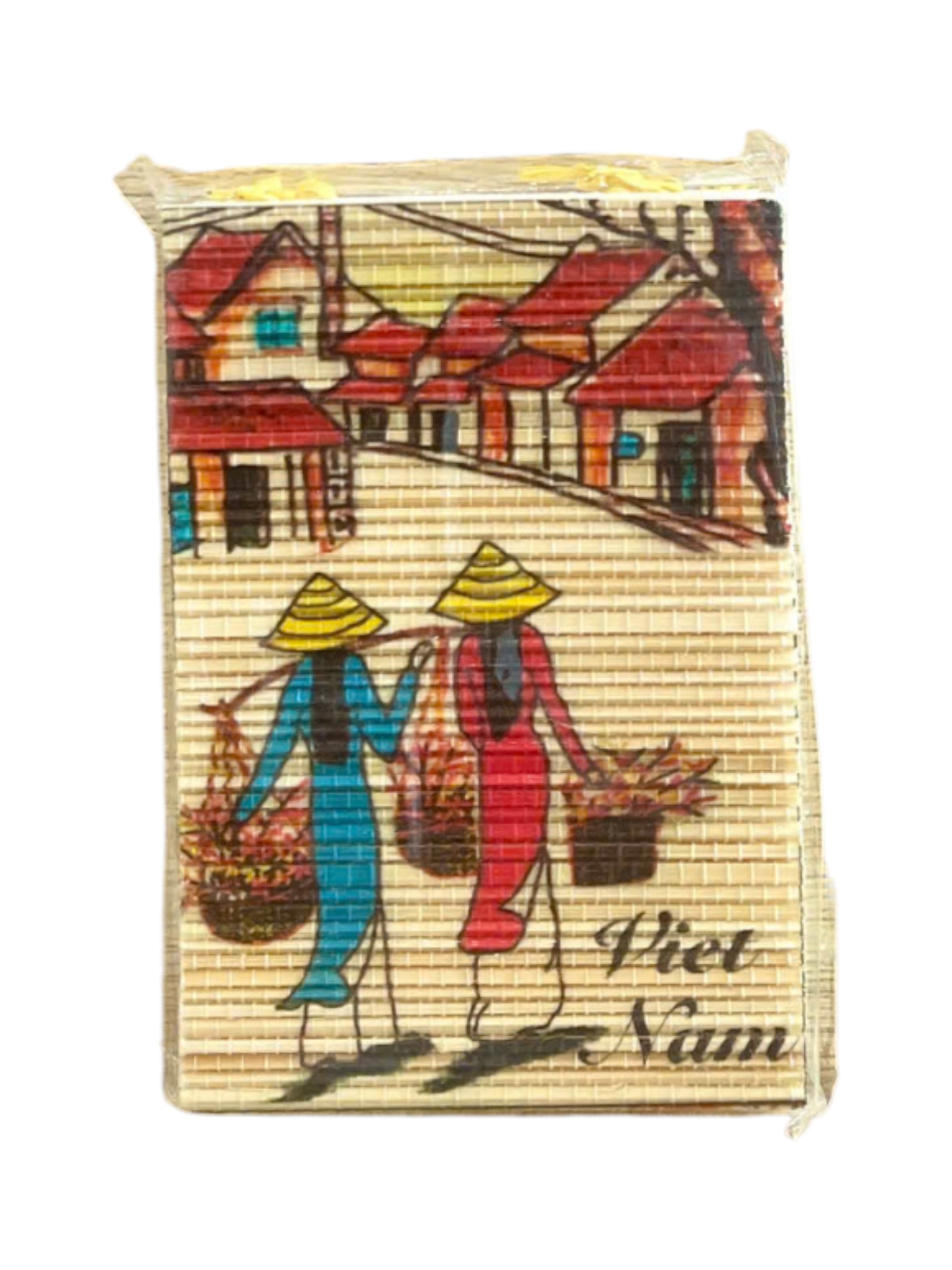 Đây là một món đồ lưu niệm nhỏ gọn, thường là sổ tay bỏ túi hoặc miếng lót ly, có bề mặt được làm từ chất liệu tre/nứa đan (hoặc vật liệu giả tre). Thiết kế: In hình ảnh sinh động mang đậm nét văn hóa Việt Nam, với hình ảnh hai người phụ nữ mặc áo dài hoặc đồ truyền thống, đội nón lá, đang gánh/xách đồ đi trên con phố cổ kính. Điểm nhấn: Có chữ "Viet Nam" được in ở góc dưới. Ứng dụng: Thích hợp dùng làm quà tặng du lịch, lưu niệm, hoặc vật dụng cá nhân nhỏ gọn.