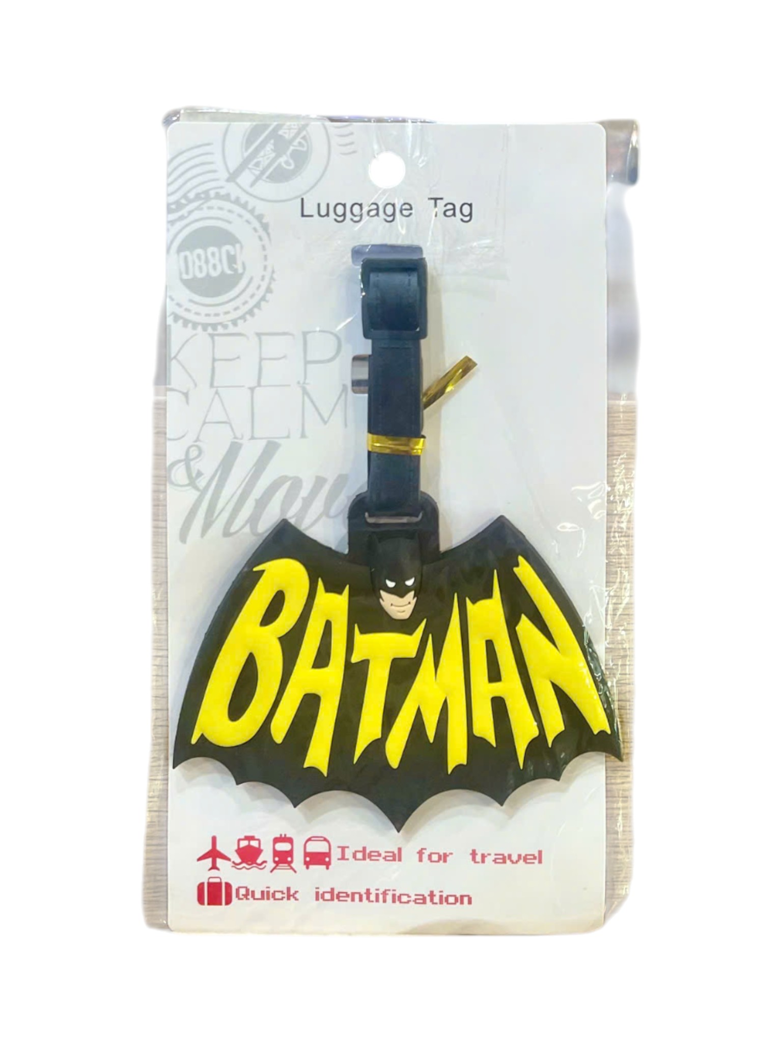 Thẻ có hình dáng nổi bật, mô phỏng biểu tượng cánh dơi màu đen và vàng đặc trưng. Dòng chữ "BATMAN" màu vàng được in đậm, nổi bật ngay trên thân thẻ.