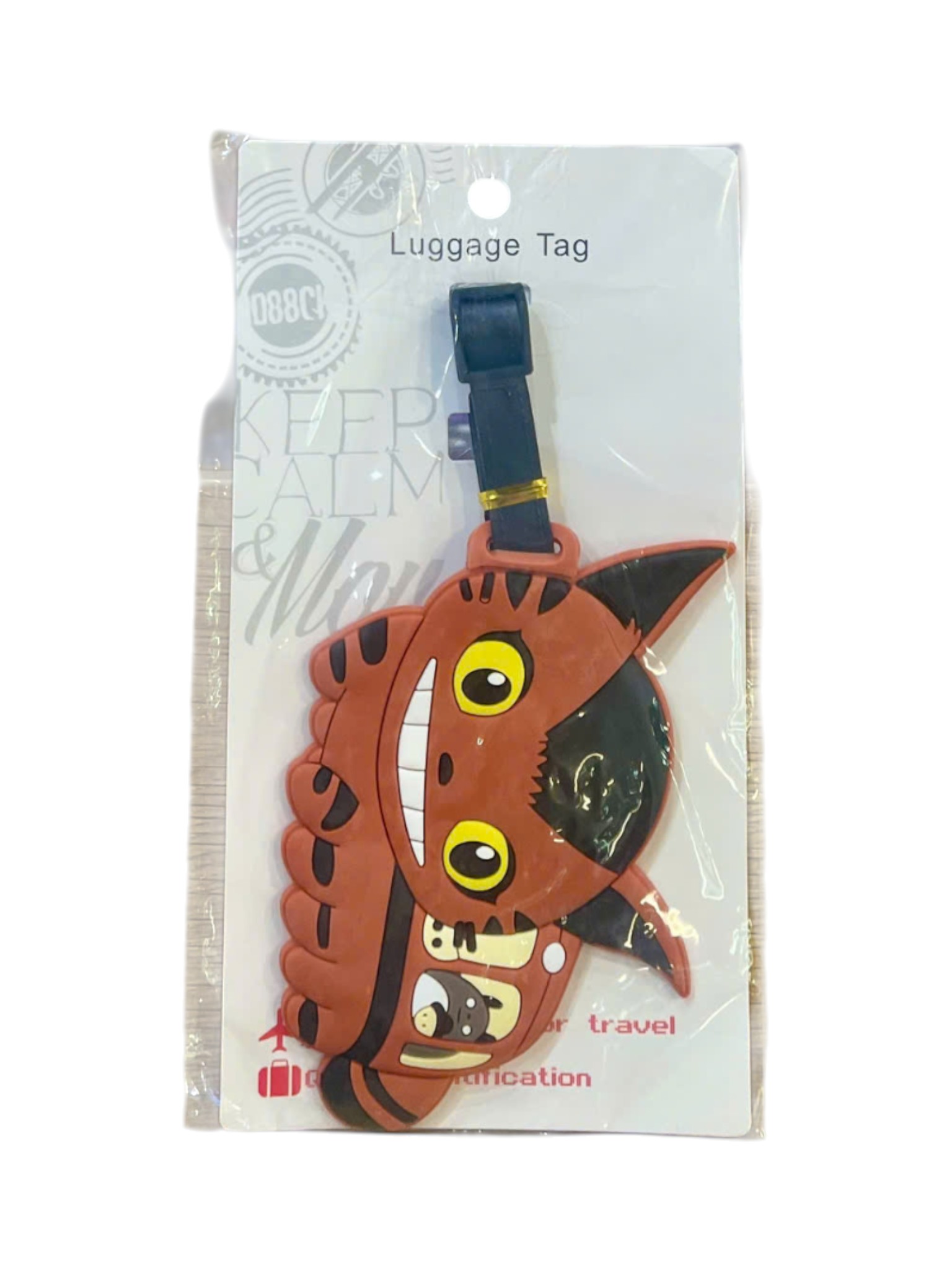 Thẻ có hình dáng một chiếc mặt nạ hoặc khuôn mặt quỷ/hổ màu nâu đỏ với các chi tiết mắt vàng, mũi đen và răng nanh nhỏ. Thiết kế này mang phong cách truyện tranh hoặc hoạt hình, không quá đáng sợ mà lại tạo cảm giác hài hước, độc đáo. Thẻ đi kèm với một dây đeo màu đen để gắn vào hành lý.