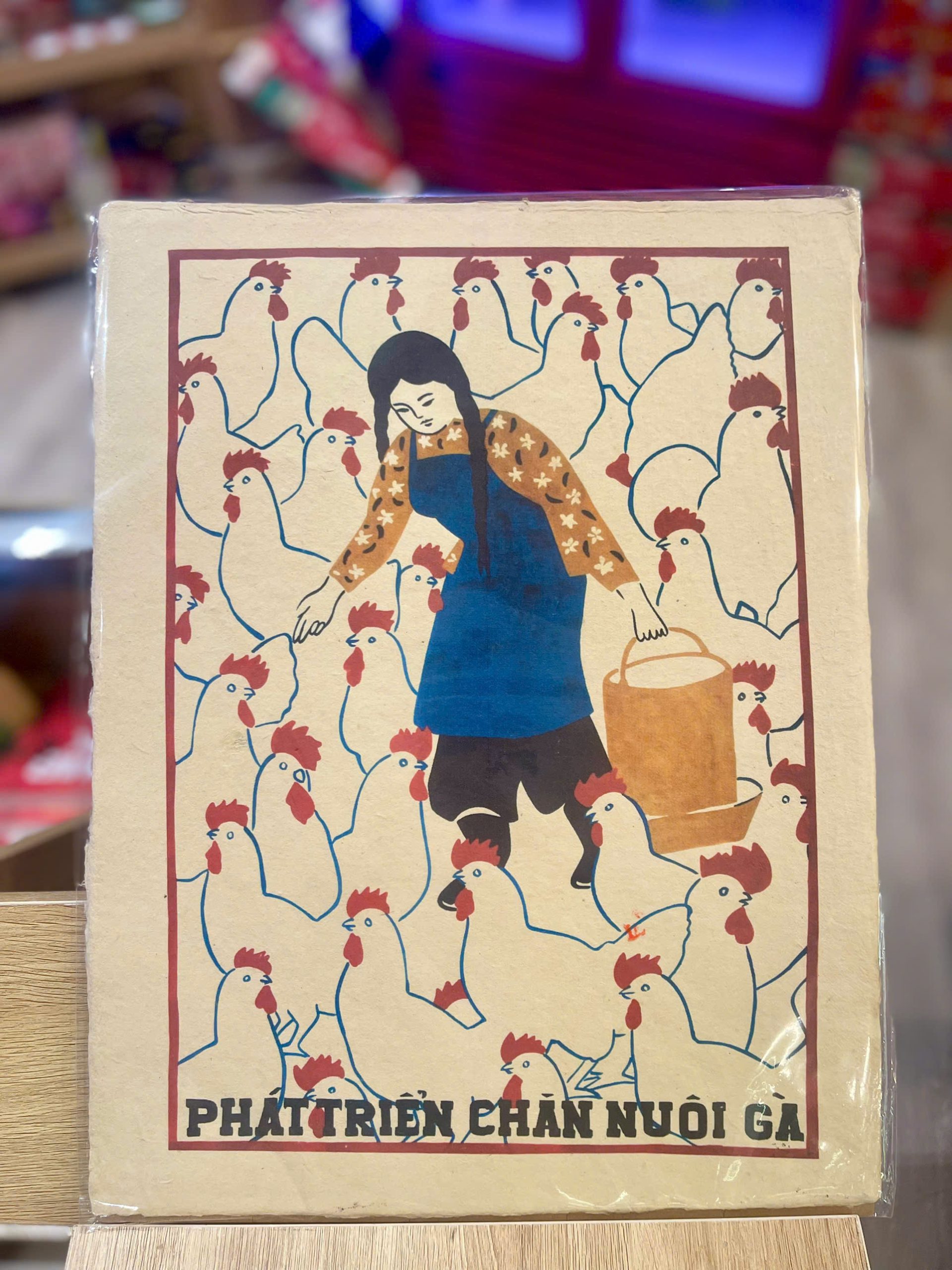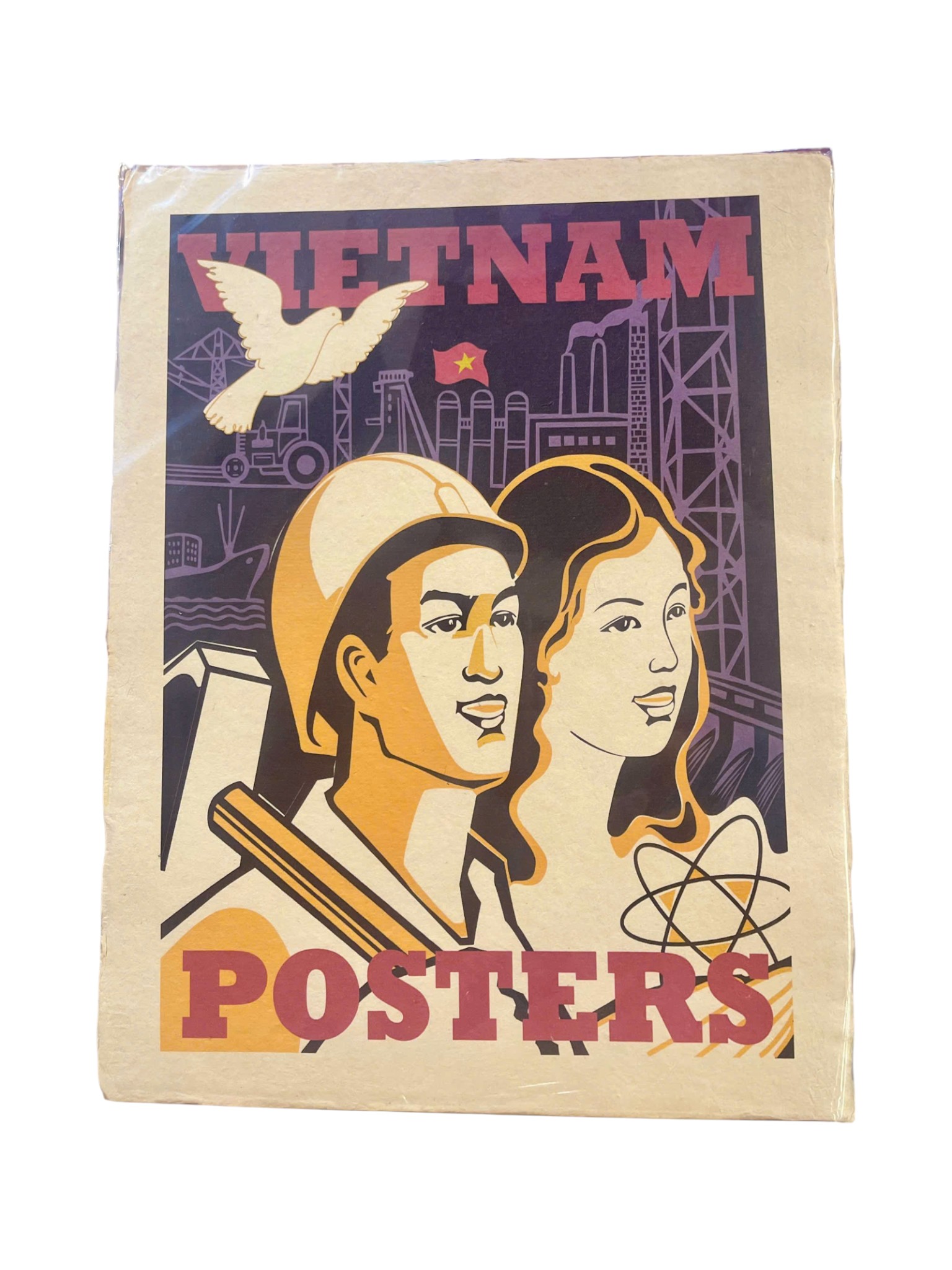 Chủ đề: Tái hiện hoặc lấy cảm hứng từ phong cách tranh cổ động (propaganda art) của Việt Nam trong giai đoạn giữa thế kỷ 20, tập trung vào chủ nghĩa xã hội và phát triển đất nước. Hình ảnh trung tâm: Nổi bật là hai nhân vật đại diện cho khối liên minh công nông và trí thức: Một công nhân nam đội mũ bảo hộ lao động, thể hiện sức mạnh và sự chăm chỉ trong sản xuất công nghiệp. Một nữ trí thức/nhà khoa học với họa tiết quỹ đạo nguyên tử, đại diện cho tiến bộ khoa học và tri thức. Bối cảnh: Phía sau là khung cảnh công nghiệp hóa mạnh mẽ với nhà máy, ống khói, cần cẩu và tàu thuyền, tượng trưng cho công cuộc xây dựng đất nước. Biểu tượng: Chim bồ câu trắng bay lên, biểu thị cho hòa bình. Chất liệu & Phong cách: Màu sắc đối lập mạnh mẽ (vàng đất, đen, đỏ) mang đậm chất nghệ thuật in ấn và tuyên truyền cổ điển