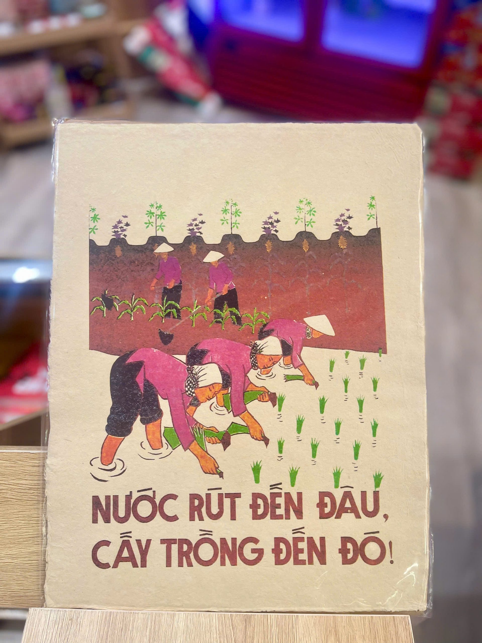 Chủ đề: Tuyên truyền về tinh thần khẩn trương và sự cần cù trong sản xuất nông nghiệp, đặc biệt là việc trồng lúa và các loại cây khác ngay khi nước rút (sau lũ lụt hoặc theo mùa). Hình ảnh: Bức tranh được chia thành hai tầng canh tác, tượng trưng cho cả lúa và hoa màu: Tầng trên (Đất cao): Một số nông dân đang làm việc trên đất khô, trồng cây cao hơn (có thể là cây công nghiệp hoặc cây thực phẩm khác). Tầng dưới (Ruộng): Ba người phụ nữ mặc áo hồng đậm và khăn trắng đang cấy lúa trong nước ruộng bùn, cúi người làm việc hăng say. Thông điệp: Dòng chữ lớn dưới cùng là "NƯỚC RÚT ĐẾN ĐÂU, CÂY TRỒNG ĐẾN ĐÓ!" (Wherever the water recedes, planting takes place immediately!). Khẩu hiệu này nhấn mạnh sự chủ động và không để đất đai bị bỏ phí. Phong cách: Nghệ thuật tuyên truyền về kinh tế, sử dụng các mảng màu phẳng (hồng, đỏ, xanh lá cây) và nét vẽ đơn giản, tập trung vào hình ảnh lao động tập thể.
