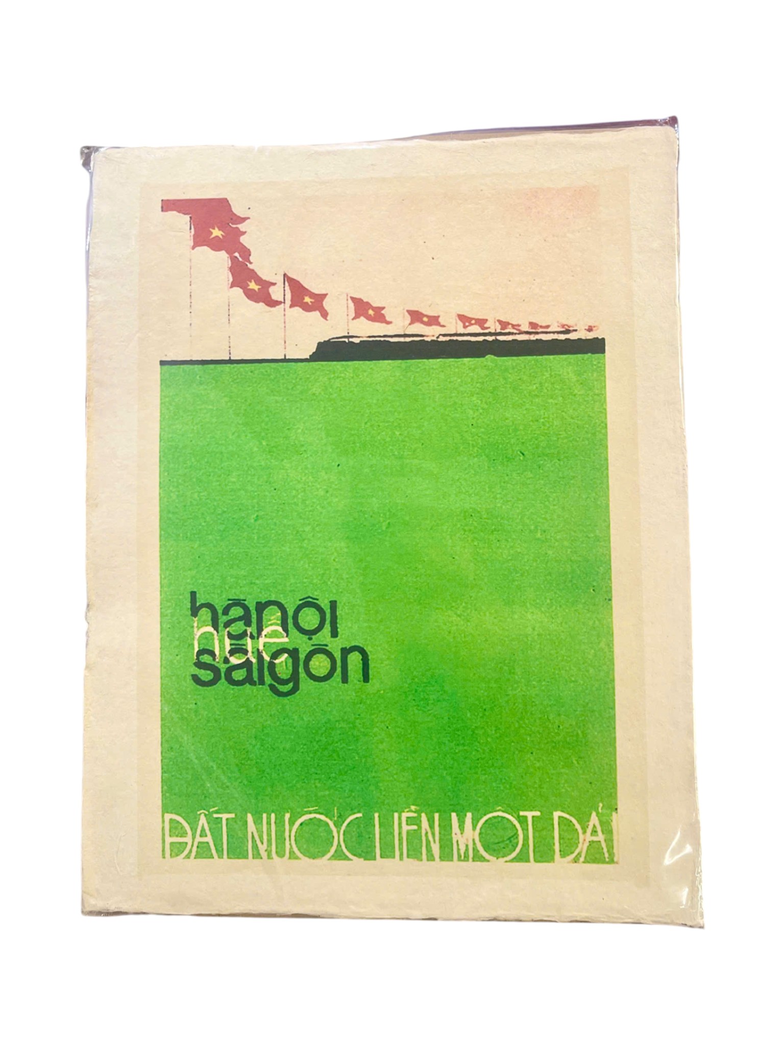 Chủ đề: Tưởng niệm Thống nhất đất nước (sau năm 1975). Thiết kế: Phong cách tối giản, hiện đại của thập niên 1970 với các mảng màu lớn. Màu xanh lá: Tượng trưng cho đồng ruộng, đất đai Việt Nam trải dài. Phần trên: Hàng cờ đỏ sao vàng bay phấp phới nối tiếp nhau, biểu tượng của chiến thắng và sự thống nhất từ Bắc chí Nam. Chữ: "hà nội sài gòn" (viết thường, in đậm) nằm ở trung tâm trên nền xanh, kết hợp với dòng chữ ở dưới "ĐẤT NƯỚC LIỀN MỘT DẢI" khẳng định chủ quyền và sự hợp nhất.