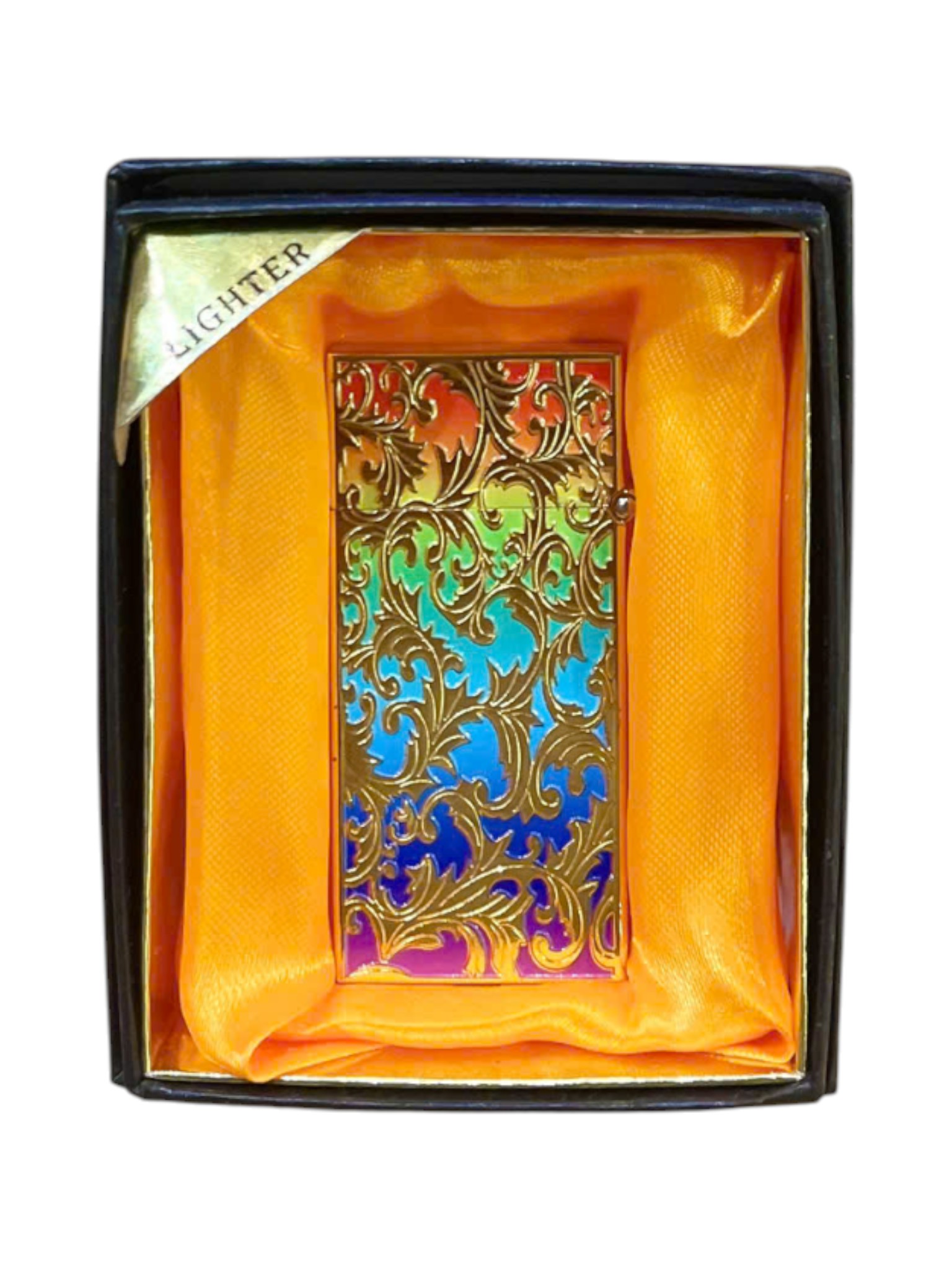Bật lửa High Grade (Cao cấp), thường là bật lửa gas hoặc xăng, có thể nạp lại. Kiểu dáng: Dạng hộp chữ nhật mỏng, dẹt (Slim), vỏ kim loại màu vàng đồng/mạ vàng. Điểm nổi bật: Trang trí bằng họa tiết cầu vồng (Spectrum/Rainbow) rực rỡ, chuyển màu mượt mà từ tím/xanh dương sang cam/đỏ. Họa tiết: Khắc chìm các vân sóng hoặc ngọn lửa cách điệu, tạo hiệu ứng thị giác năng động và cá tính.