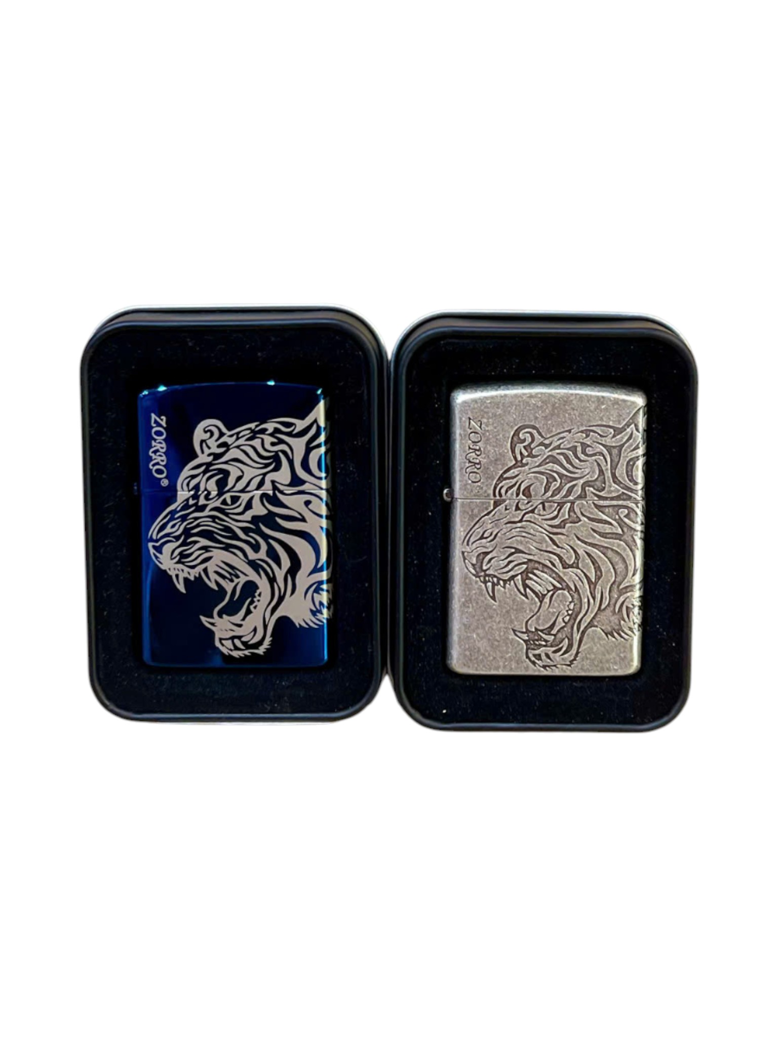 Tên gọi: Bật lửa Zorro Chủ đề Hổ (Tiger Theme Lighter). Kiểu dáng: Dạng hộp chữ nhật cổ điển, bật nắp (Zippo-style), được đặt trong hộp quà đen.