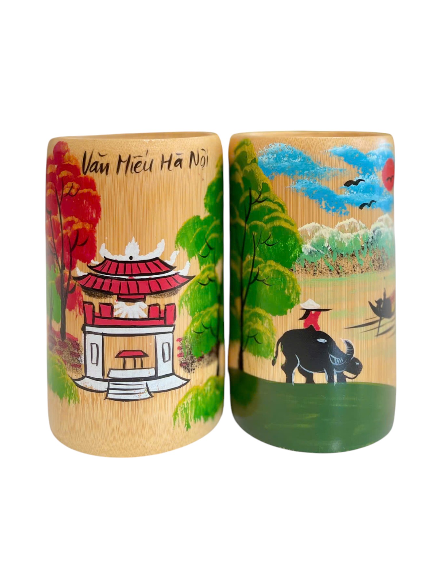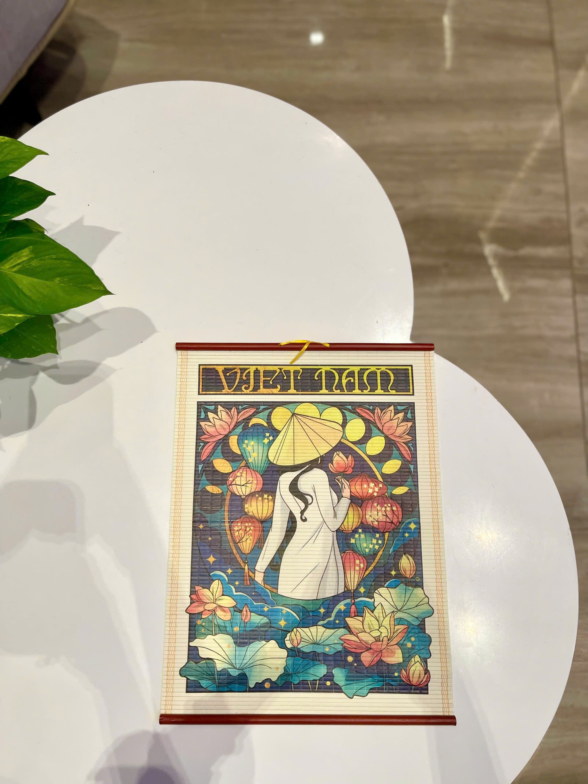 Chất liệu: Tranh được in trên chất liệu tre/trúc cuốn, tạo cảm giác mộc mạc, truyền thống và dễ dàng cuộn lại. Phong cách: Nghệ thuật minh họa hiện đại với hơi hướng tân cổ điển (Art Nouveau) hoặc tối giản, sử dụng các đường nét đậm, viền đen và màu sắc rực rỡ. Hình ảnh trung tâm: Một người phụ nữ trong trang phục Áo dài trắng truyền thống, đội nón lá, quay lưng lại. Bao quanh cô là các họa tiết truyền thống của Việt Nam: Hoa sen (biểu tượng quốc hoa) ở phía trước và các loại đèn lồng (thường thấy trong lễ hội, ví dụ như ở Hội An) ở phía sau. Chữ: Dòng chữ "VIỆT NAM" được in nổi bật ở phía trên. Ý nghĩa: Kết hợp hài hòa giữa vẻ đẹp thanh lịch của phụ nữ Việt Nam, trang phục truyền thống và các biểu tượng văn hóa đặc trưng.