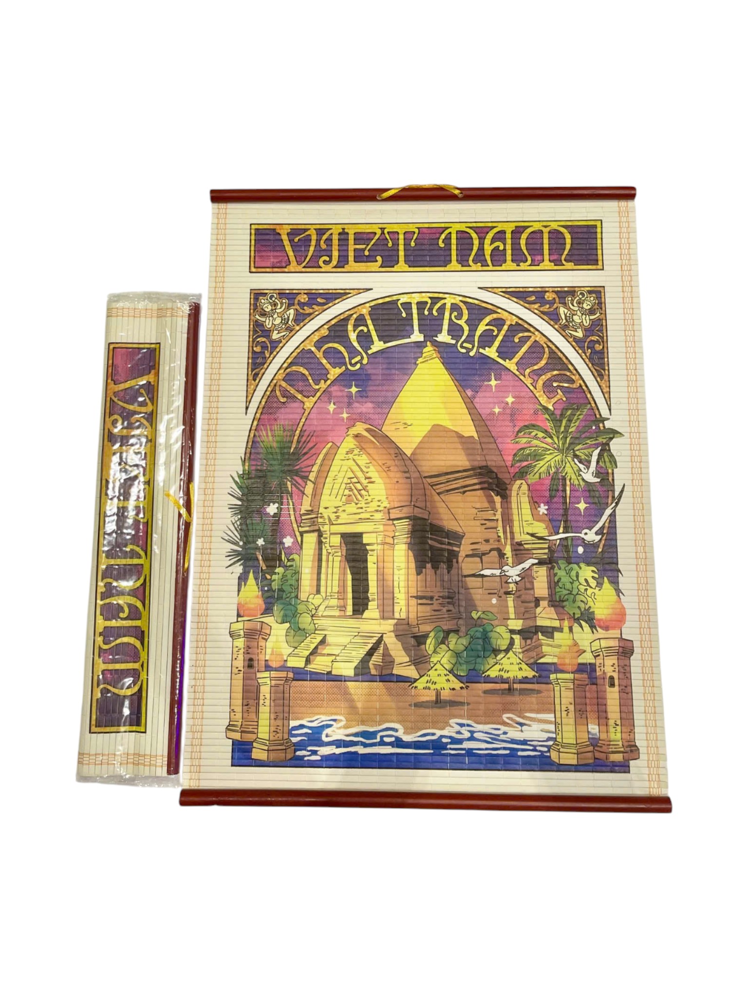 Chất liệu: Tranh in trên tre/trúc cuốn. Chủ đề: Cảnh quan du lịch và lịch sử tại Nha Trang, Khánh Hòa. Hình ảnh chính: Hình ảnh nổi bật của một Tháp Chăm cổ kính (có thể là Tháp Bà Ponagar) dưới bầu trời đêm đầy sao hoặc hoàng hôn. Bối cảnh: Bao gồm cây dừa đặc trưng ven biển, chim biển và nước biển màu xanh đậm, kết hợp kiến trúc cổ với vẻ đẹp nhiệt đới. Phong cách: Nghệ thuật minh họa hiện đại, với tông màu rực rỡ (tím, hồng, vàng rực) mang hơi hướng Art Deco/kỳ ảo. Chữ: "VIỆT NAM" phía trên và "NHA TRANG" ở trung tâm.
