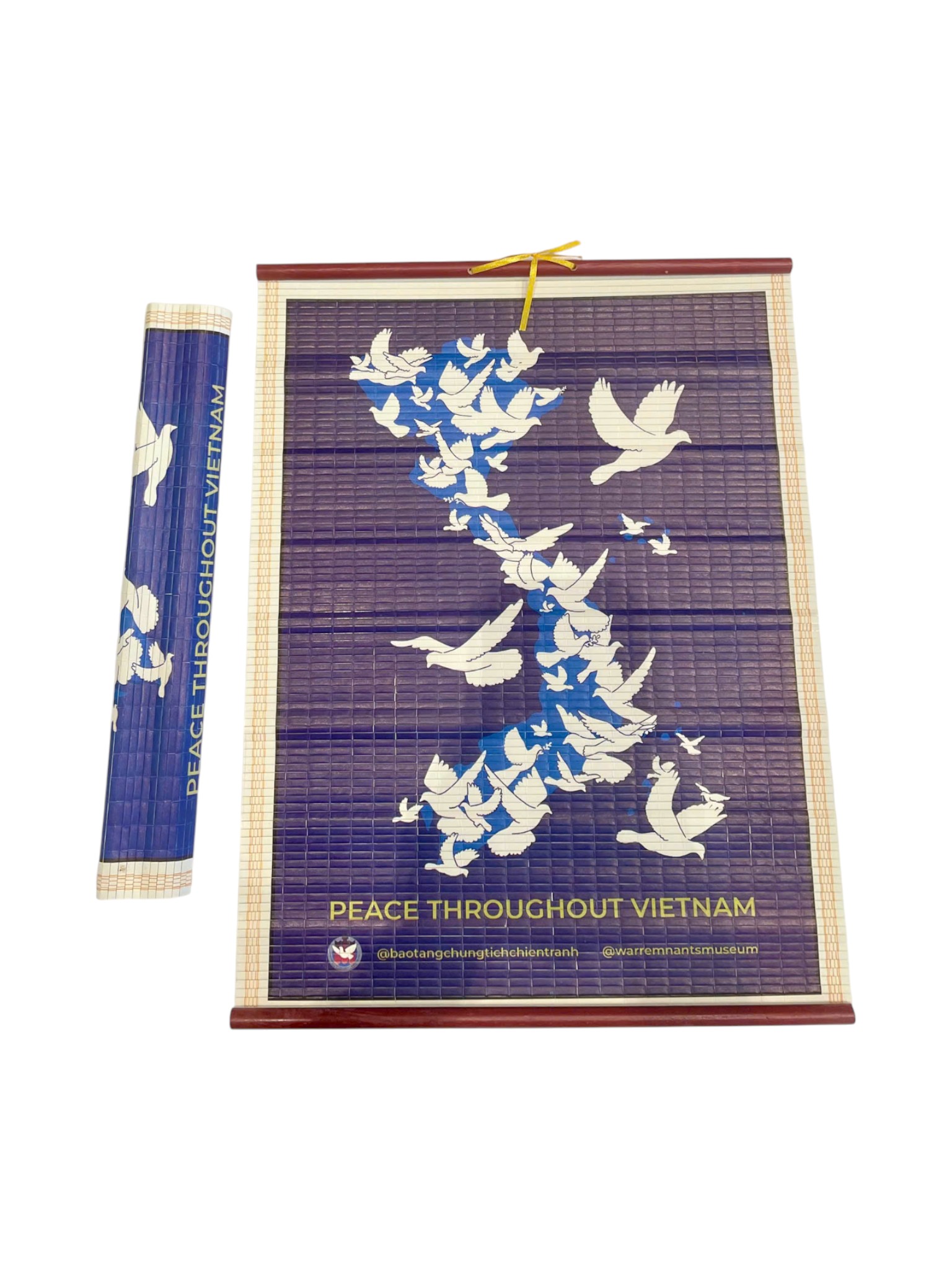 Chất liệu: Tranh in trên tre/trúc cuốn, có nền màu tím đậm. Chủ đề: Tuyên truyền về Hòa bình và Thống nhất của Việt Nam. Hình ảnh chính: Một đàn bồ câu trắng đang bay lên, tạo thành hình dáng bản đồ địa lý Việt Nam (từ Bắc vào Nam). Chữ: Dòng chữ tiếng Anh "PEACE THROUGHOUT VIETNAM" (Hòa bình khắp Việt Nam) ở phía dưới. Ý nghĩa: Biểu tượng mạnh mẽ về hòa bình, sự thống nhất lãnh thổ và tinh thần dân tộc, thường liên kết với các bảo tàng chiến tranh hoặc kỷ niệm lịch sử.