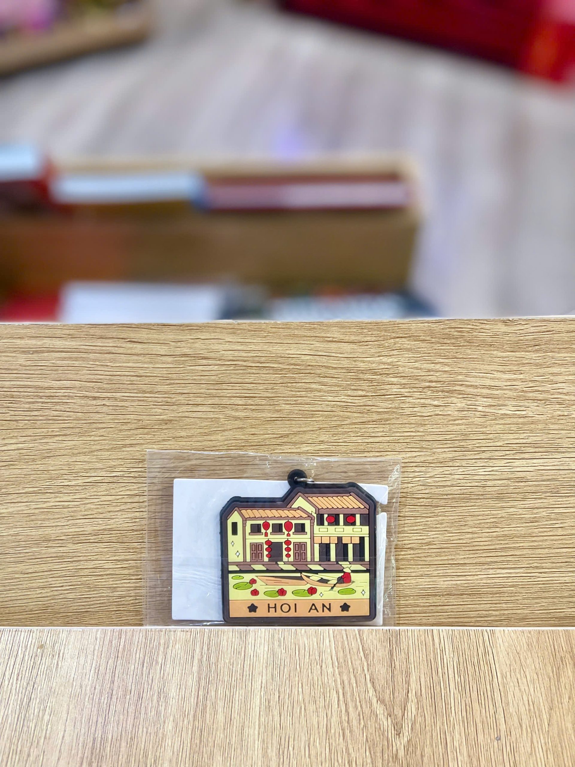 Móc khóa cao su bền, được tạo hình đáng yêu theo kiến trúc nhà cổ truyền thống của Phố cổ Hội An. Thiết kế nổi bật với tường vàng cổ điển, mái ngói đỏ và những chiếc đèn lồng đặc trưng. Đây là một món quà lưu niệm hoặc vật kỷ niệm xinh xắn từ thành phố lịch sử Hội An, Việt Nam.