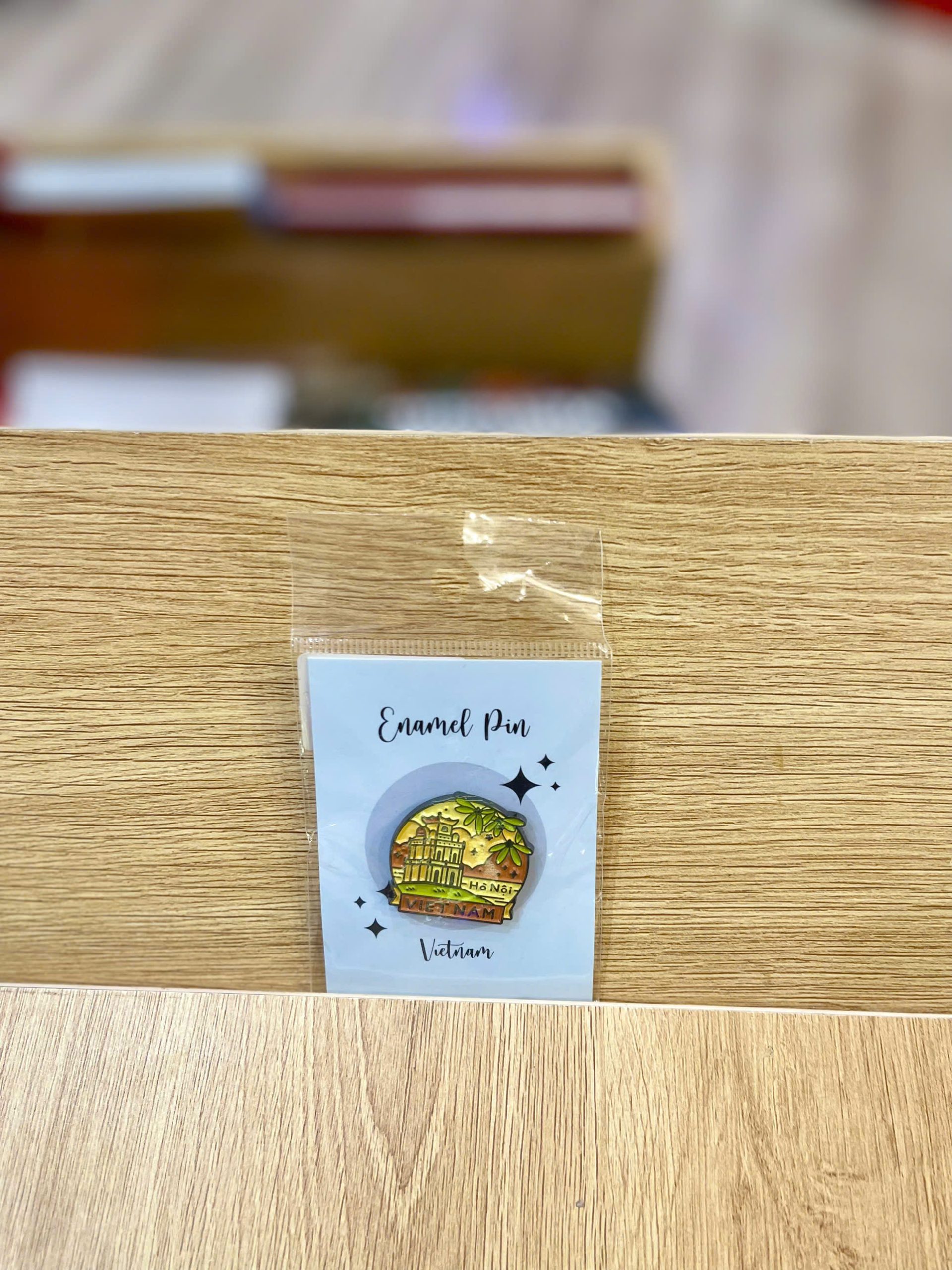 Ghim cài áo (Enamel Pin) được thiết kế chi tiết, mô tả cảnh quan mang tính biểu tượng của Hồ Hoàn Kiếm tại Hà Nội. Họa tiết nổi bật với hình ảnh Tháp Rùa trên đảo nhỏ, cùng với các yếu tố khác thể hiện nét duyên dáng độc đáo của thành phố, kèm theo chữ "HÀ NỘI" và "VIET NAM". Đây là một phụ kiện hoặc món quà lưu niệm hoàn hảo để gợi nhớ về thủ đô của Việt Nam.