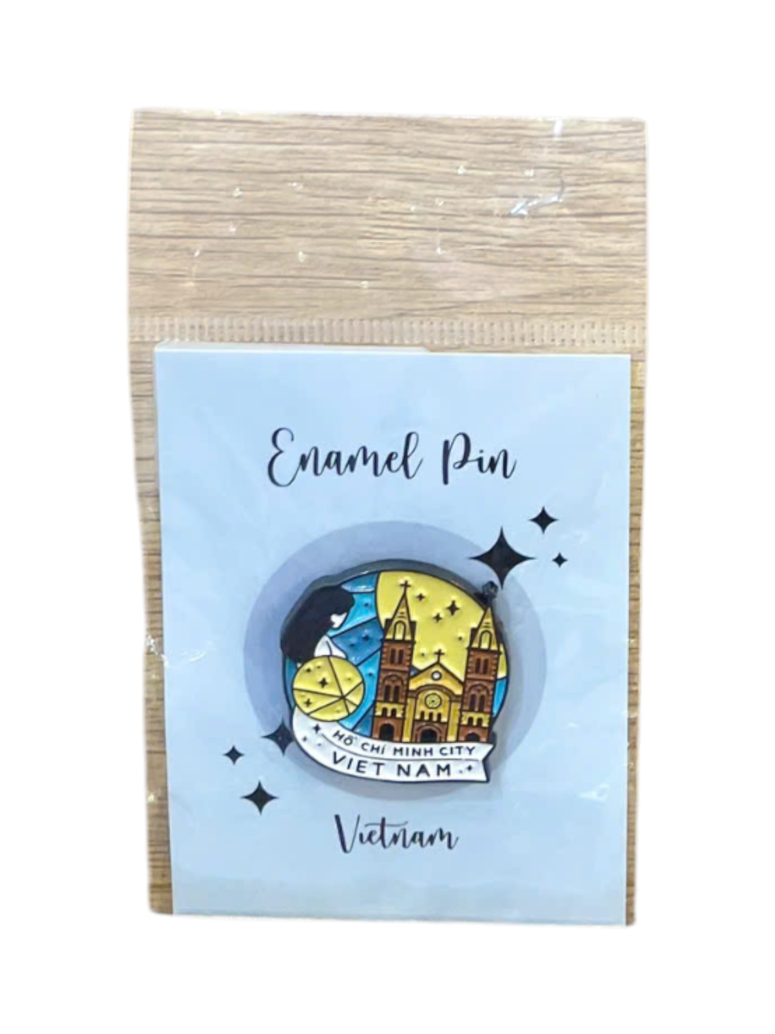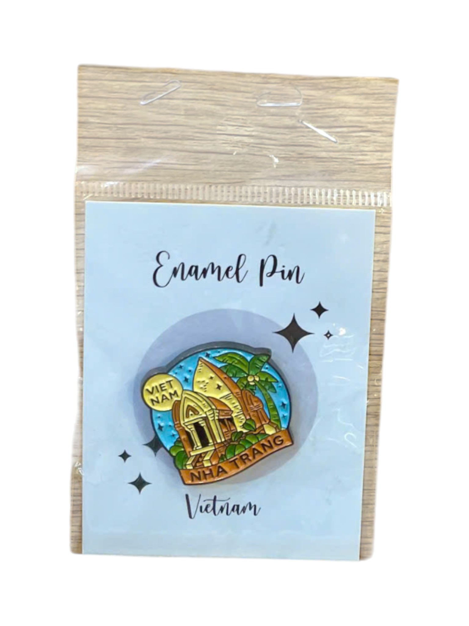 Ghim cài áo (Enamel Pin) được thiết kế chi tiết, mô tả quần thể kiến trúc lịch sử Tháp Bà Po Nagar (Tháp Chăm Po Nagar), một địa danh mang tính biểu tượng tại Nha Trang, Việt Nam. Họa tiết khắc họa kiến trúc độc đáo của khu đền tháp, kèm theo chữ "NHA TRANG" và "VIET NAM". Chiếc ghim này là món quà lưu niệm tuyệt vời cho những ai yêu thích lịch sử văn hóa phong phú và các thành phố biển của Việt Nam.