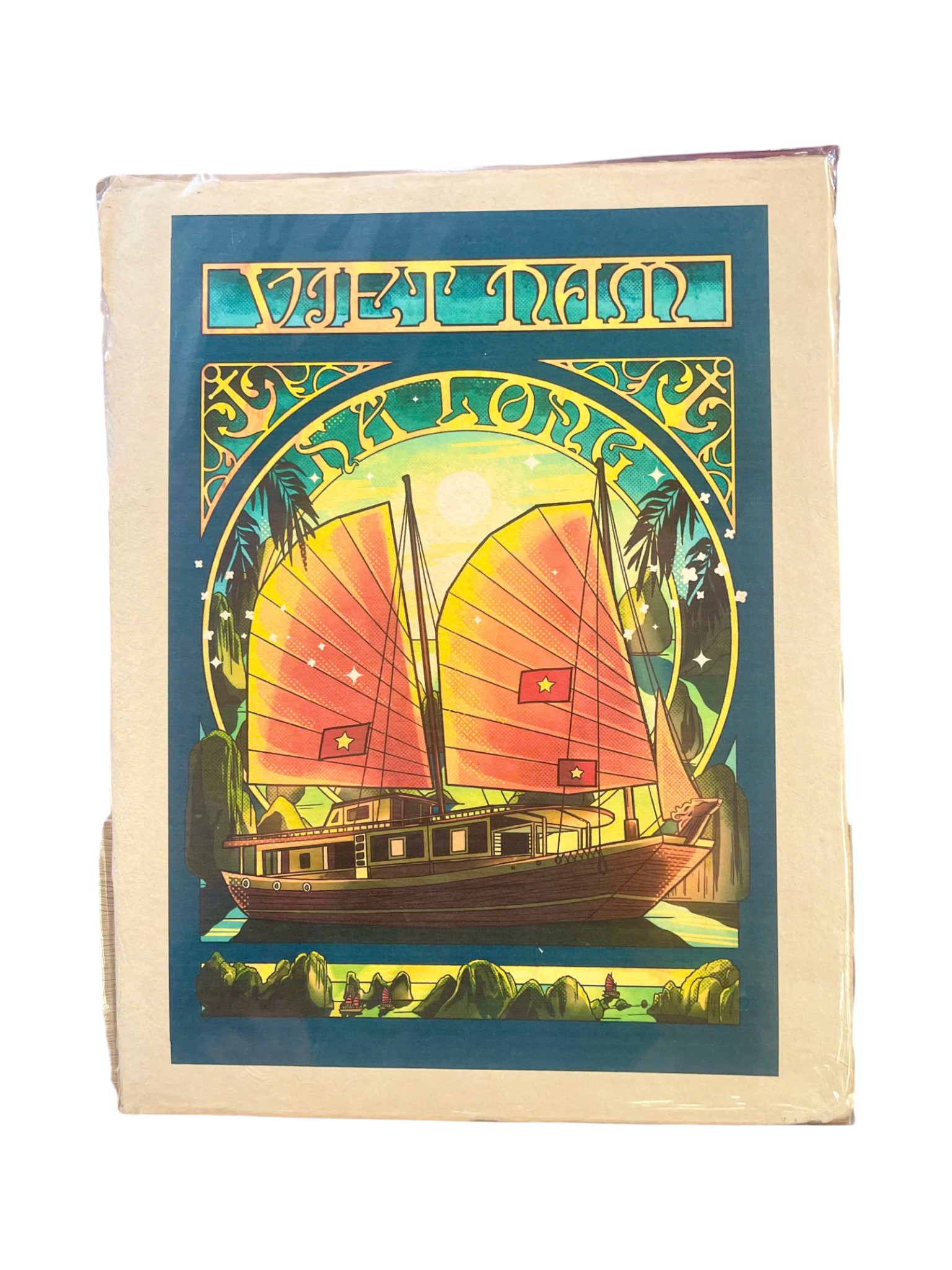 Tấm áp phích (poster) có phong cách Art Nouveau quyến rũ, tôn vinh kỳ quan thiên nhiên Vịnh Hạ Long, Việt Nam. Thiết kế lấy cảm hứng cổ điển, nổi bật với hình ảnh Thuyền buồm truyền thống với cánh buồm màu đỏ cam ấn tượng (có in sao vàng), đang lướt qua các đảo đá vôi, dưới ánh mặt trời rực rỡ. Được in trên chất liệu giấy mang cảm giác cổ kính và đề các tiêu đề "VIỆT NAM" và "HẠ LONG", đây là một tác phẩm nghệ thuật độc đáo, xinh đẹp, hoàn hảo để sưu tầm hoặc làm kỷ vật từ Di sản Thế giới UNESCO này.