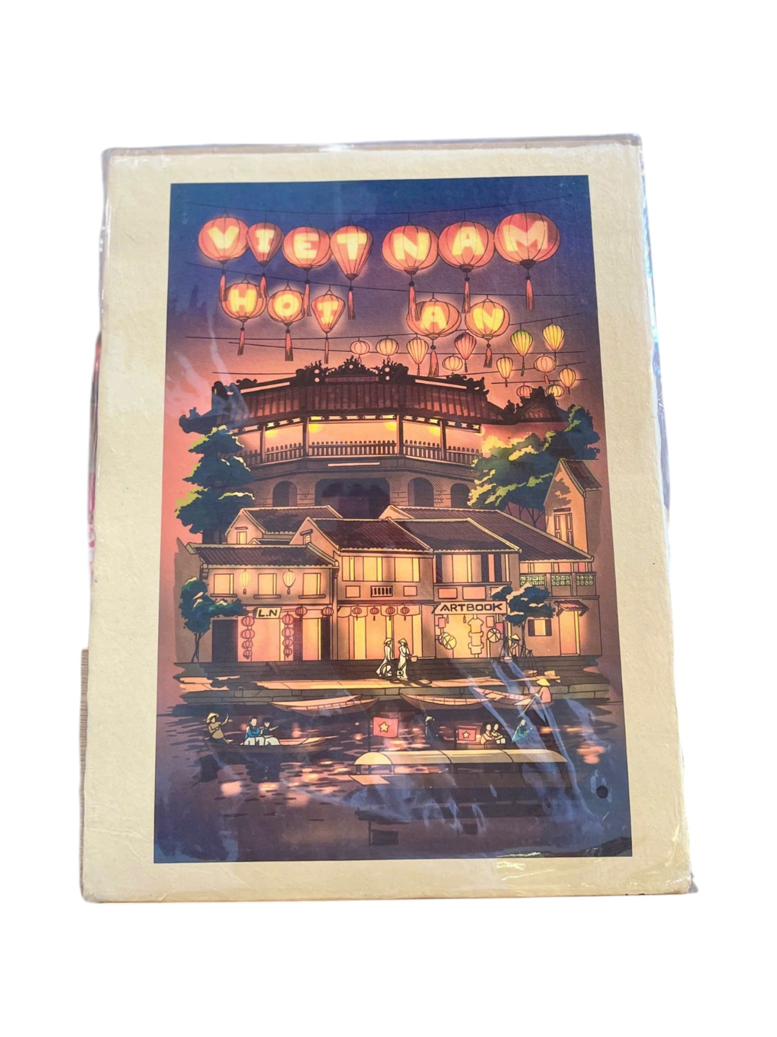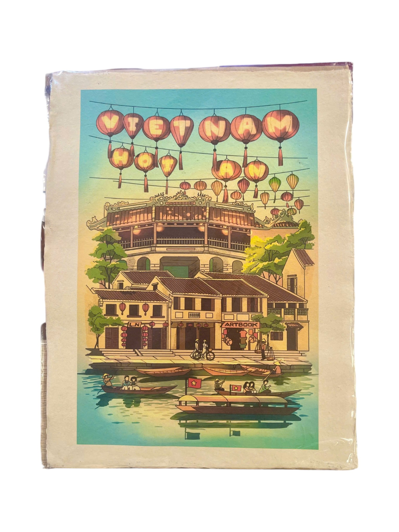 Tấm áp phích (poster) có phong cách Art Nouveau quyến rũ, tôn vinh không khí huyền ảo của Phố cổ Hội An về đêm. Thiết kế lấy cảm hứng cổ điển, nổi bật với kiến trúc mang tính biểu tượng và Chùa Cầu, được thắp sáng rực rỡ bởi vô số đèn lồng đầy màu sắc cùng hình ảnh phản chiếu trên sông. Áp phích đề các tiêu đề "VIET NAM" và "HOI AN". Được in trên chất liệu giấy mang cảm giác cổ kính, tác phẩm nghệ thuật độc đáo này là món quà lưu niệm hoặc vật trang trí hoàn hảo, ghi lại tinh thần mê hoặc của thành phố.