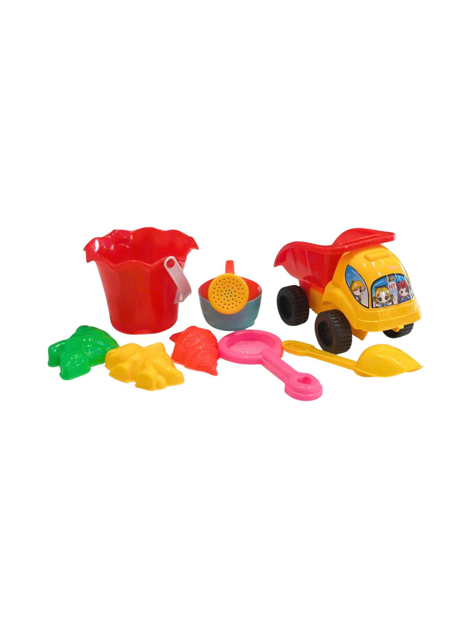 Là một chiếc xe tải đồ chơi (dump truck) có thùng sau lớn, màu vàng và đỏ nổi bật, dùng để trẻ em chở cát hoặc các món đồ chơi khác trên bãi biển.