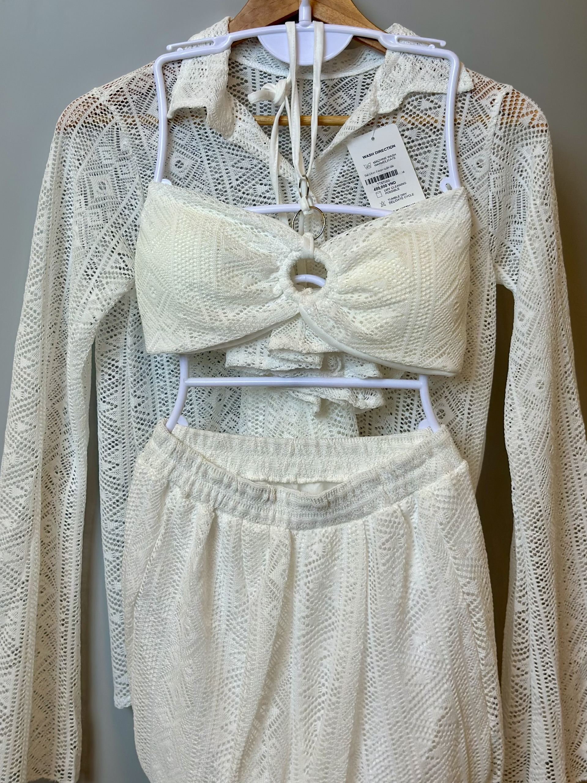 Bộ bikini 3 món đi biển với thiết kế ren lưới độc đáo sẽ làm bạn nổi bật trên bãi biển.