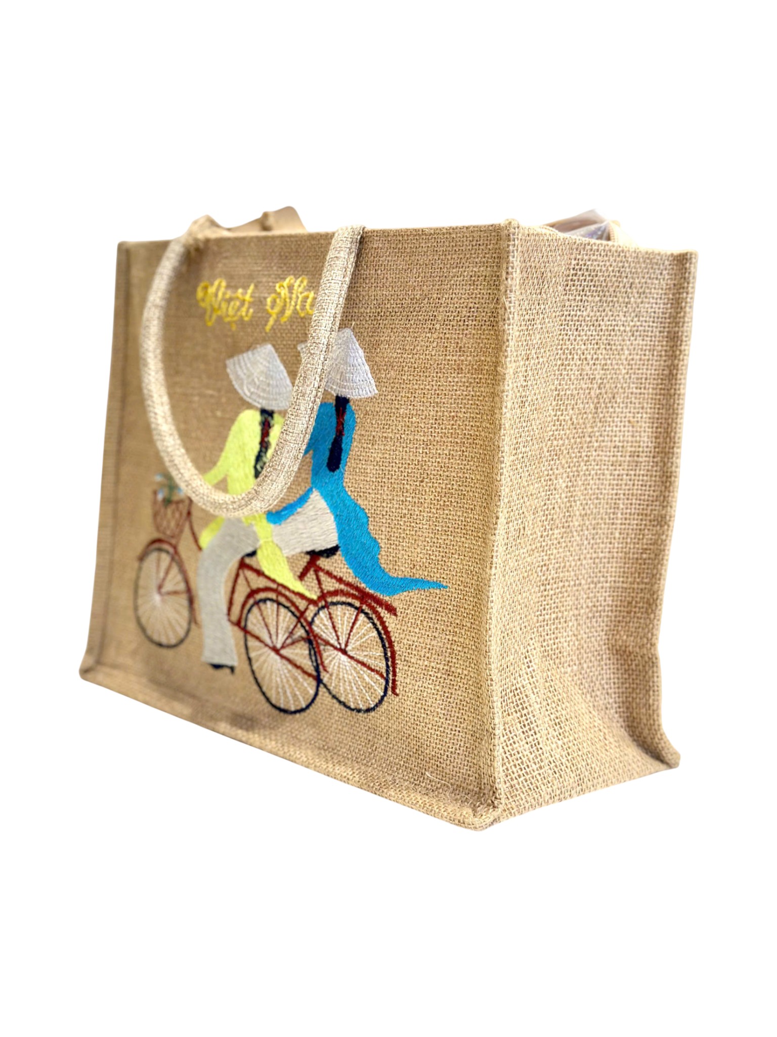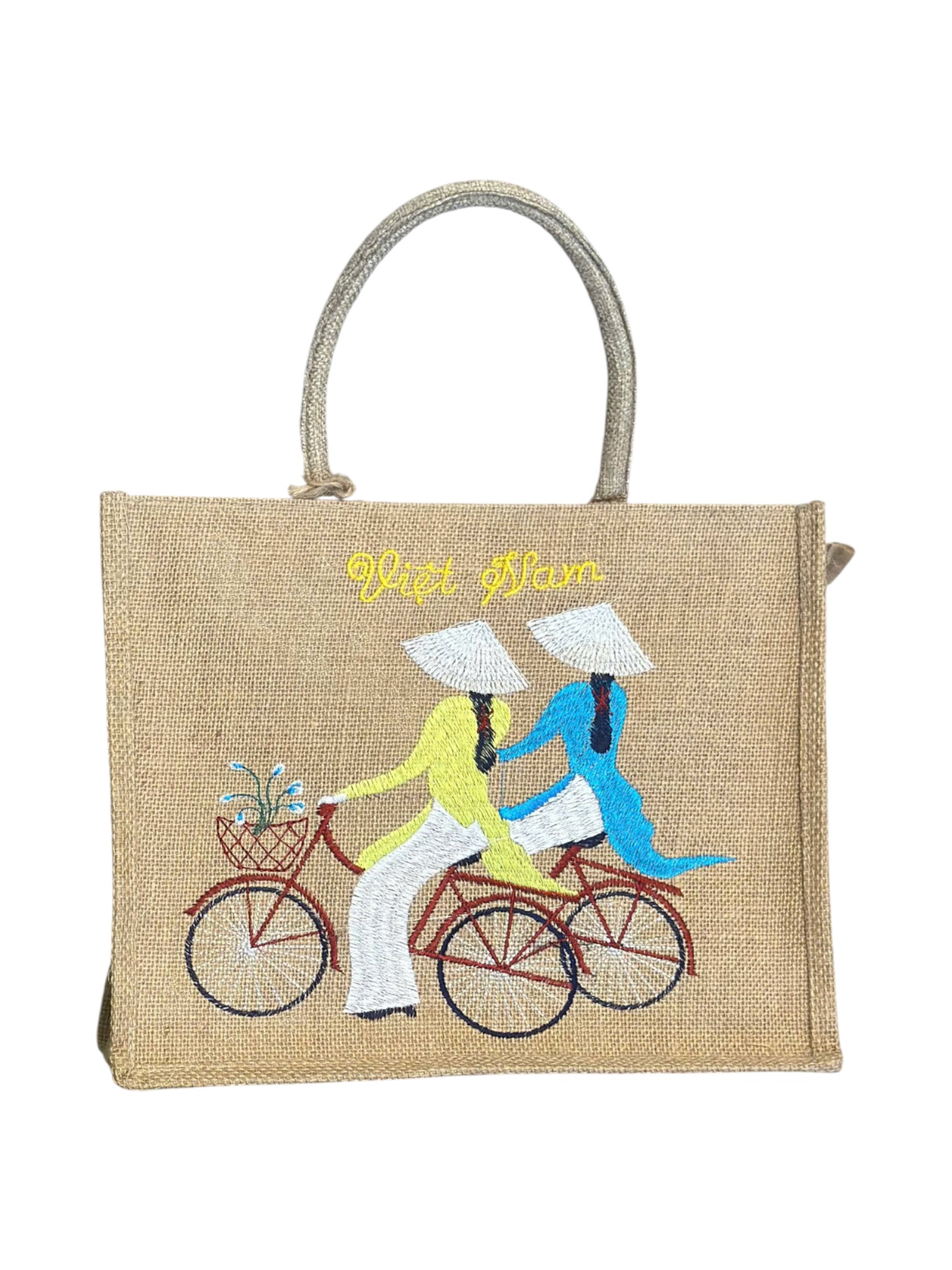Là một chiếc túi vải bố (hoặc jute) có kích thước nhỏ gọn, quai xách màu be, được thêu họa tiết hình hai cô gái mặc áo dài và nón lá đang đạp xe với dòng chữ "Việt Nam" màu vàng nổi bật.