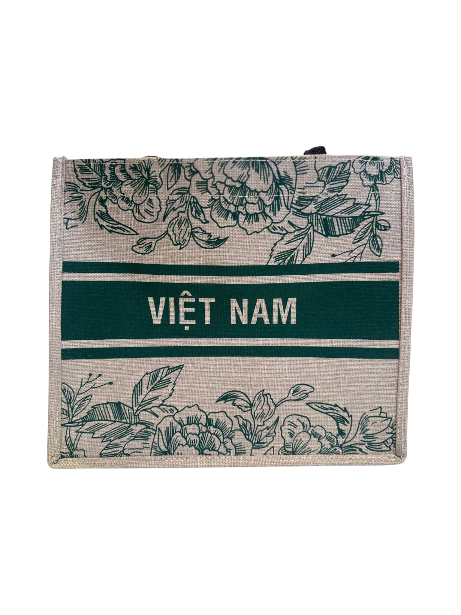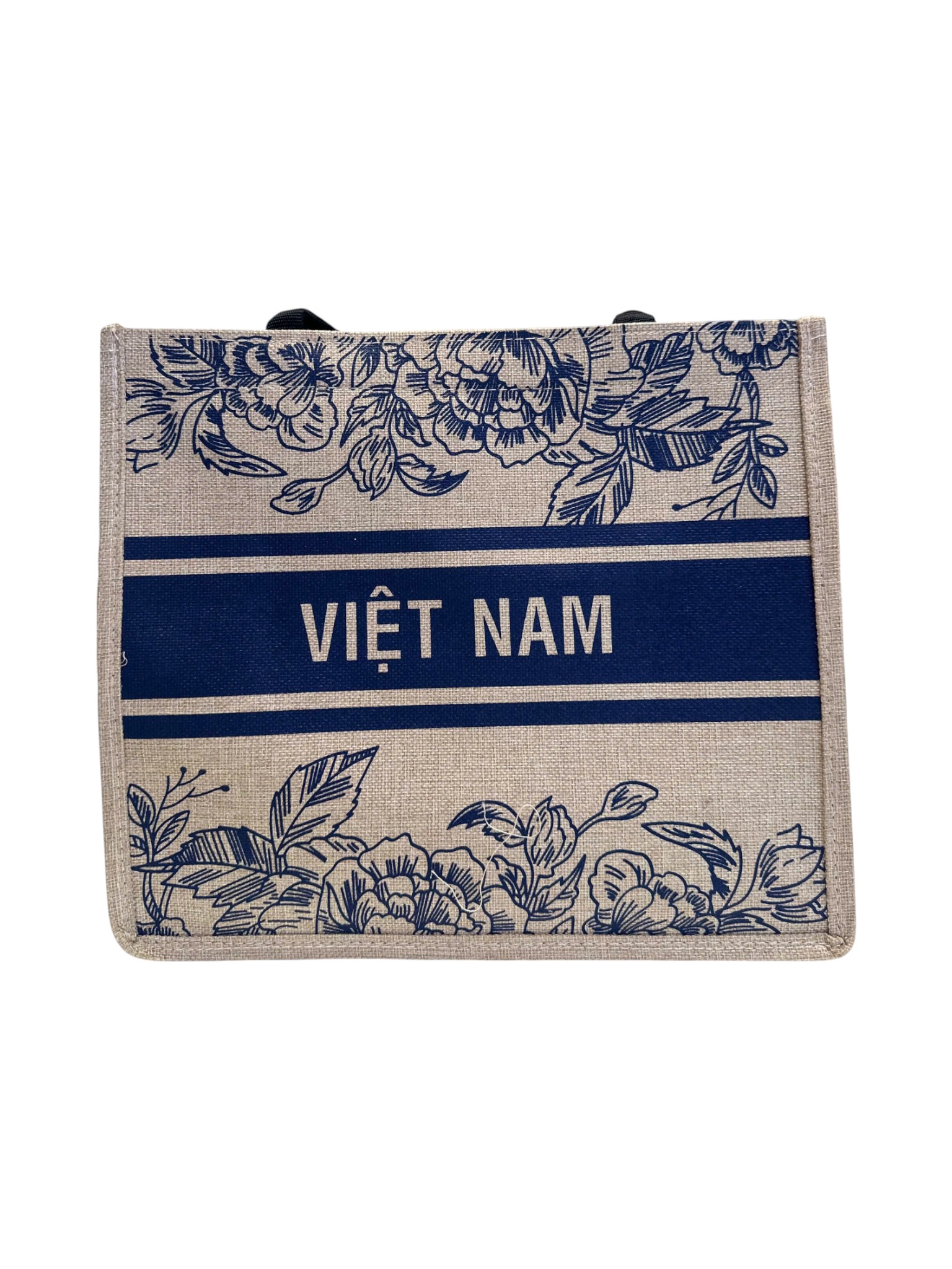 Là một chiếc túi vải bố (hoặc túi canvas/jute) hình hộp chữ nhật lớn, có khóa kéo (giả định) ở miệng túi, màu be tự nhiên với họa tiết hoa văn dân tộc và in chữ "VIỆT NAM" màu xanh đậm nổi bật, thường dùng cho du lịch hoặc đựng đồ đa năng.