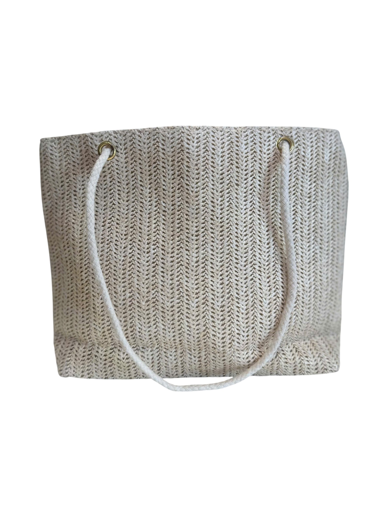 Là chiếc túi xách cói/rơm dệt thủ công màu be nhạt, quai đeo dây thừng trắng, được thêu các họa tiết hoa nhí màu hồng và xanh lá cây, cùng với một chiếc nơ ren trắng nhỏ trang trí