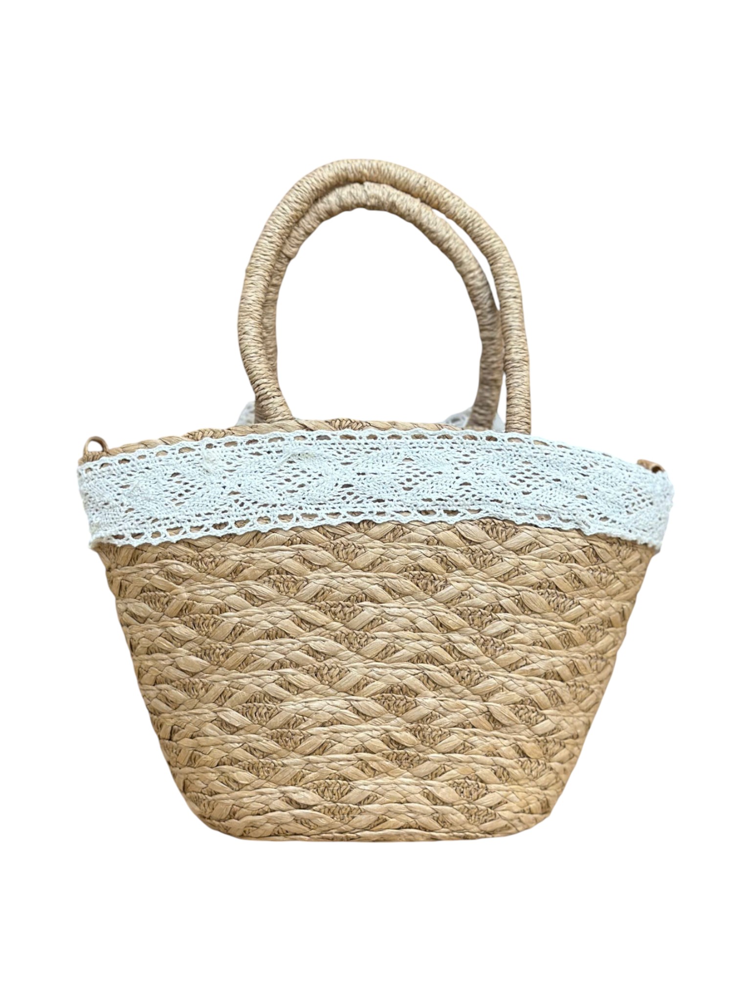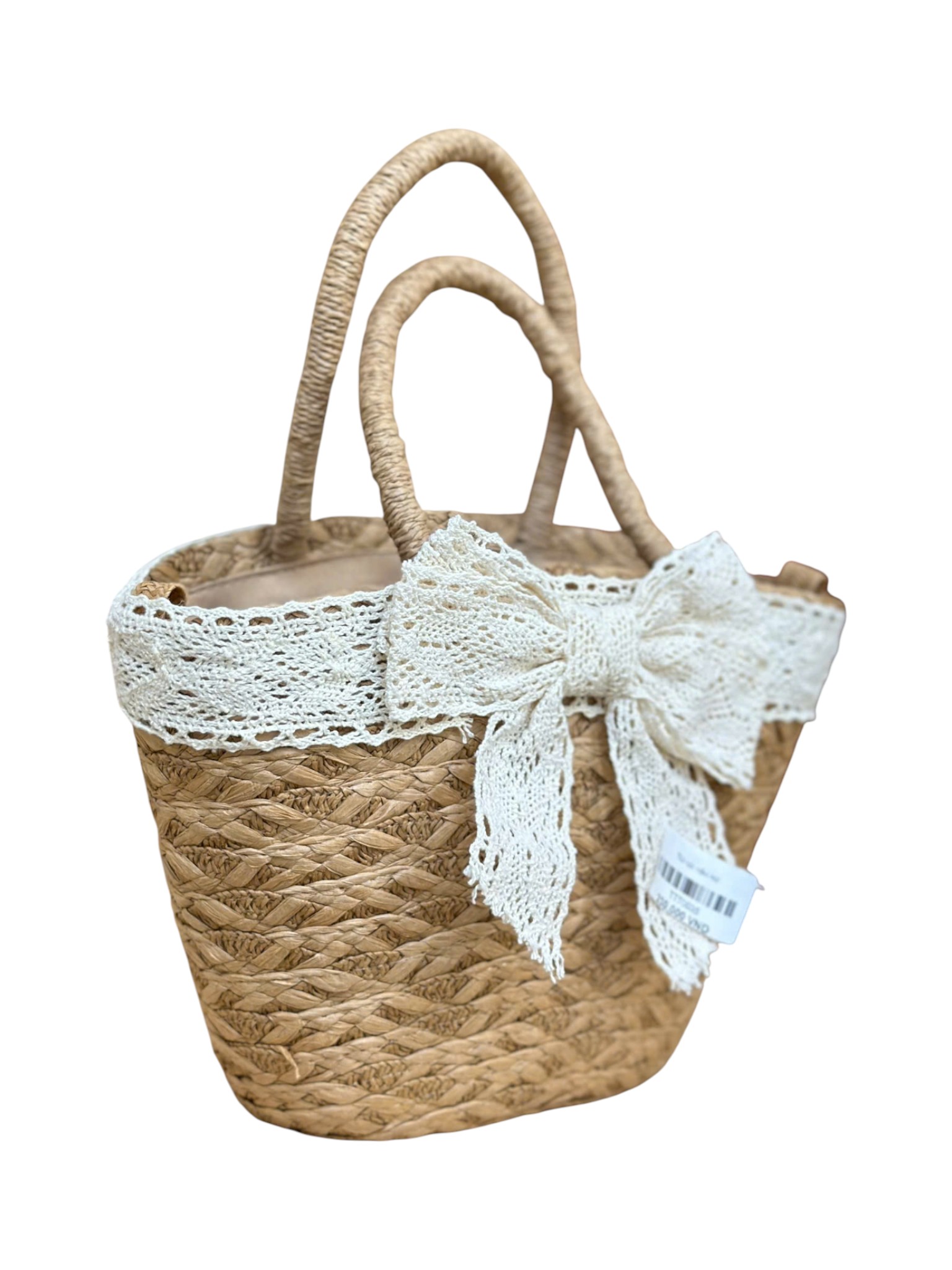 Là chiếc túi xách cói/rơm dệt thủ công cỡ nhỏ, có quai xách tết bím cùng màu, thân túi màu nâu nhạt, và được trang trí bằng một chiếc nơ ren lớn màu trắng kem tinh tế ở mặt trước.