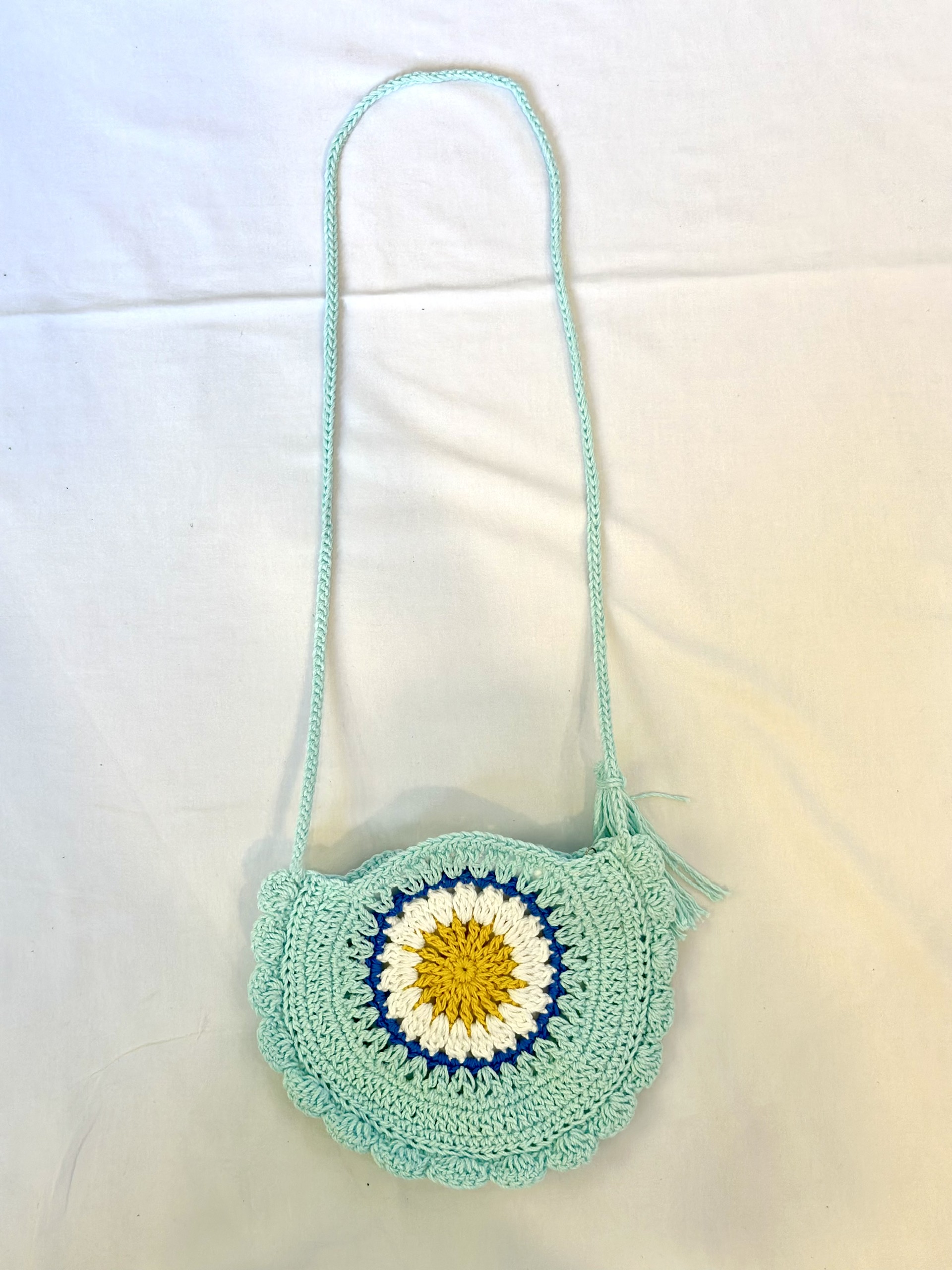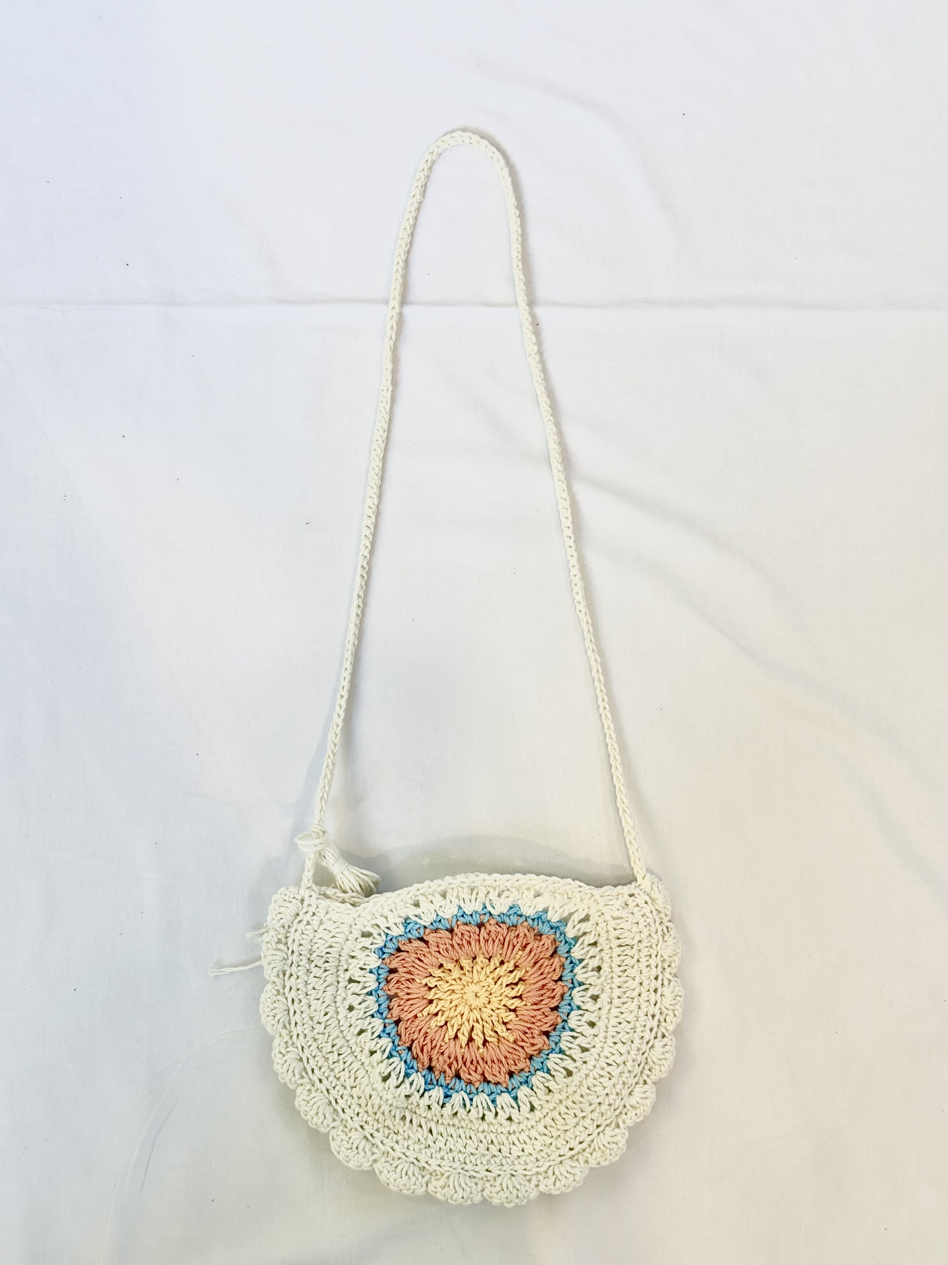 "Chất liệu: Sợi cotton đan thủ công, mềm mại và bền đẹp. Thiết kế: Hình bán nguyệt độc đáo, hoa văn tròn nổi bật ở giữa. Dây đeo dài, có thể đeo chéo vai tiện lợi. Phong cách: Vintage – Bohemian, mang lại cảm giác nhẹ nhàng và nữ tính. Màu sắc: Trắng – hồng – xanh pastel, dễ phối với nhiều loại trang phục."